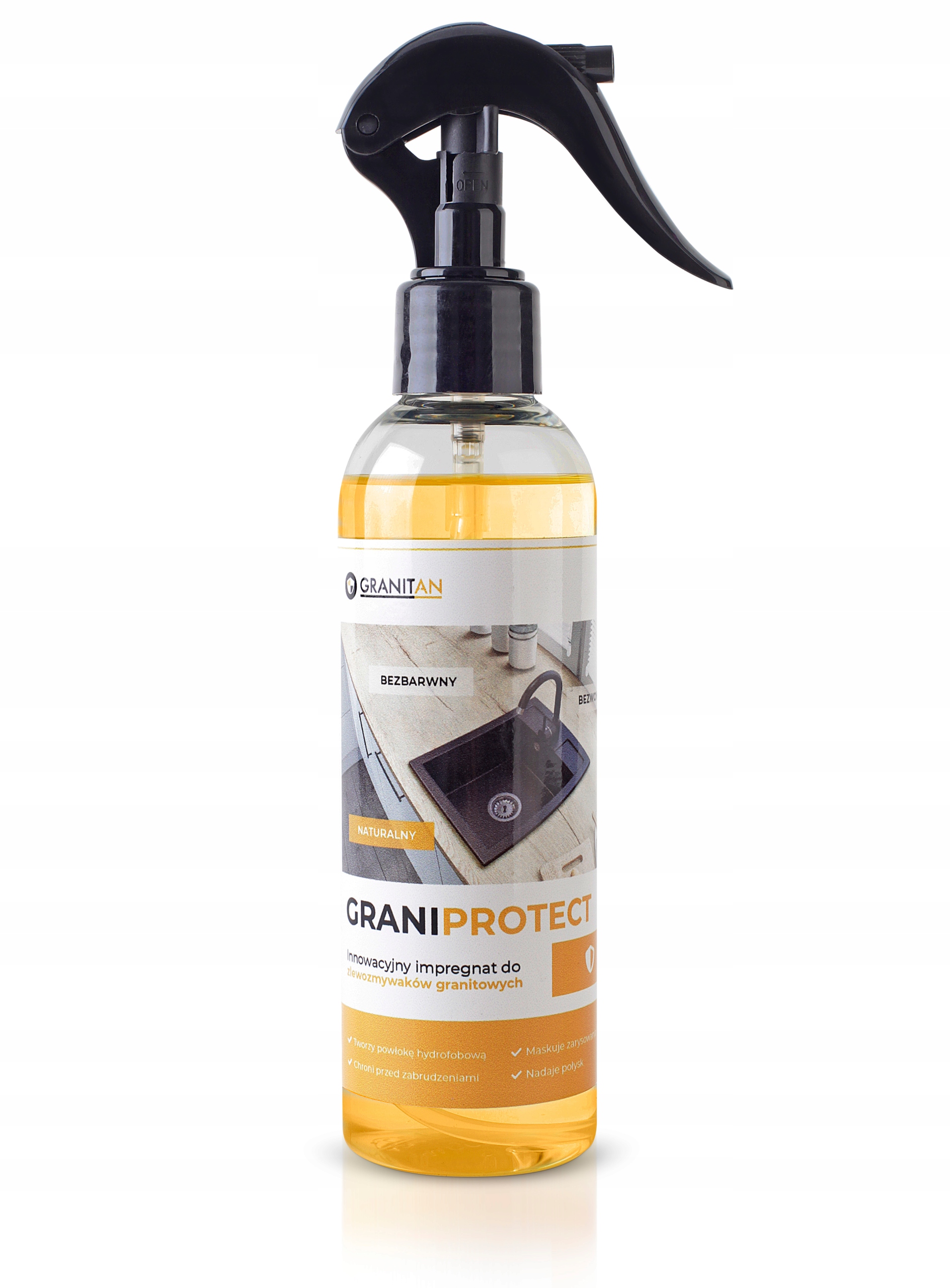 Impregnant profesional pentru chiuvete din granit. Datorită proprietăților sale, este excelent și pentru elementele realizate din materiale plastice, precum și din inox. Maschează zgârieturile, îmbunătățește aspectul general al chiuvetei și facilitează întreținerea zilnică a curățeniei.