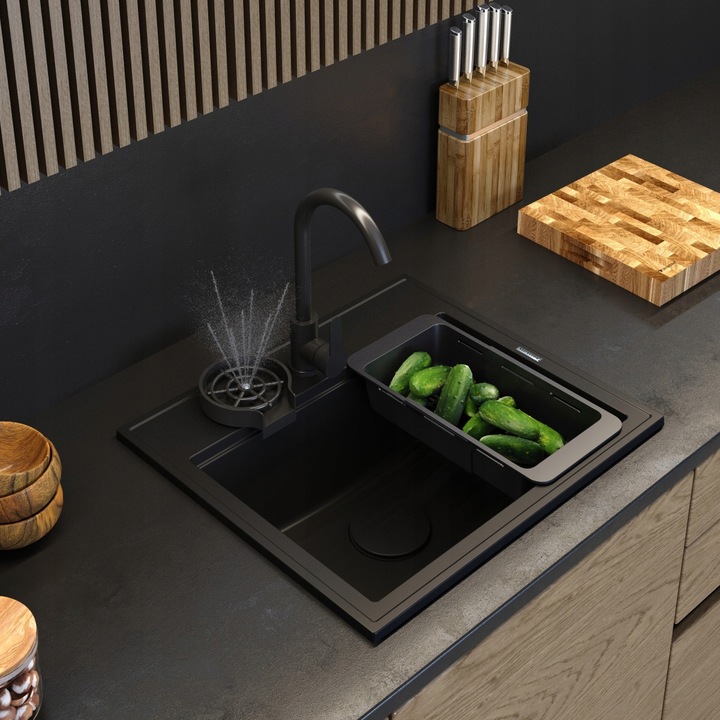 Modelul este realizat din material plastic durabil, care se remarcă atât prin funcționalitate în utilizarea zilnică, cât și prin faptul că asigură un aspect estetic întregii chiuvete.