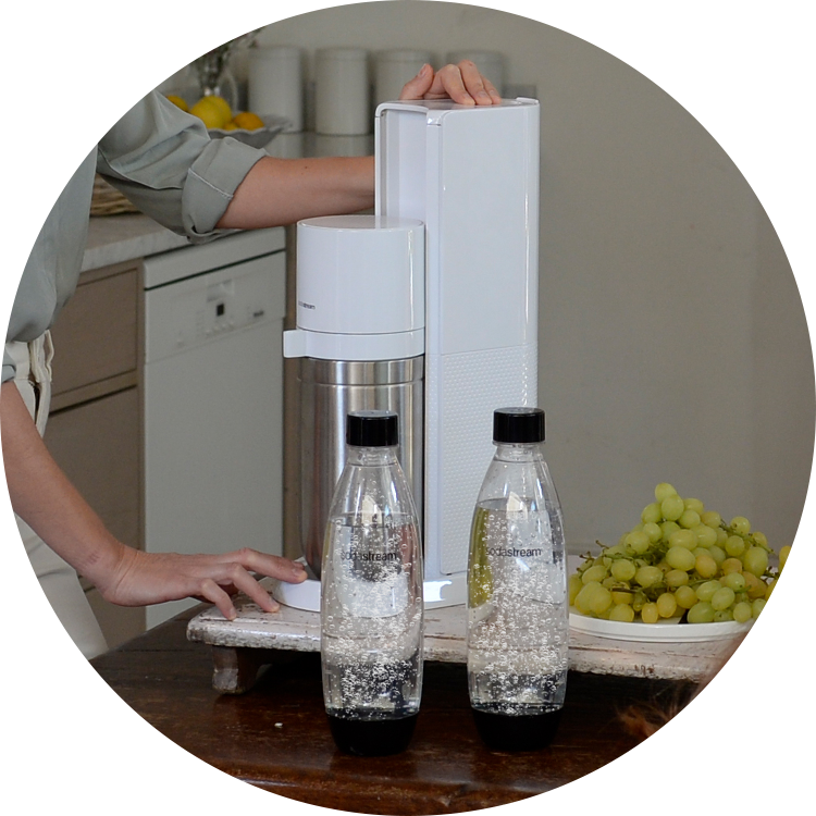 Prepară apă carbogazoasă în sticle din plastic și din sticlă, în funcție de ocazie. Ambele pot fi spălate în mașina de spălat vase.