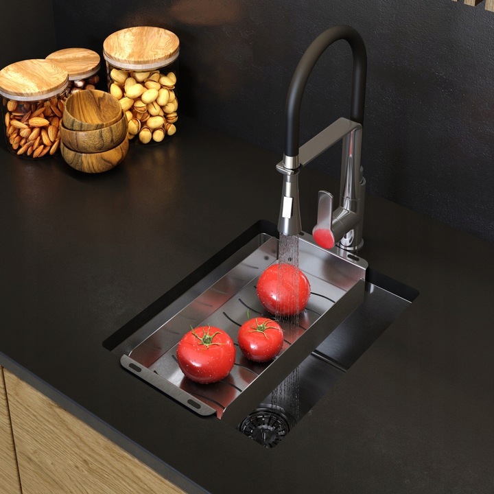 - Design funcțional cu caneluri profilate care permit drenarea eficientă a apei de pe vase, tacâmuri sau oale.