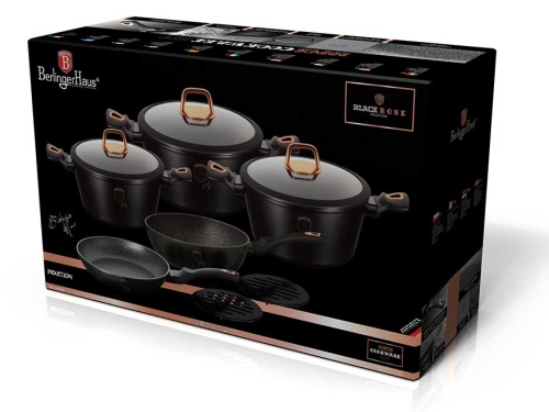 Oalele și tigăile din seria BLACK ROSE de la BERLINGER HAUS sunt realizate din aluminiu forjat de înaltă calitate, acoperit la interior cu un strat granitat (marble) triplu, având un coeficient foarte ridicat de duritate. Strat exterior de culoare neagră. Aceste vase atractive și moderne sunt echipate standard cu mânere de tip SOFT TOUCH (mânere de silicon). Adaptate pentru toate tipurile de plite: gaz, electric, ceramic, halogen, inducție. Sistemul TURBO INDUCTION (se încălzesc foarte repede) permite economisirea a până la 35% din energie.