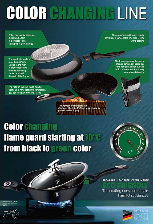 Schimbarea culorii mânerului semnalizează în verde când tigaia atinge temperatura optimă.