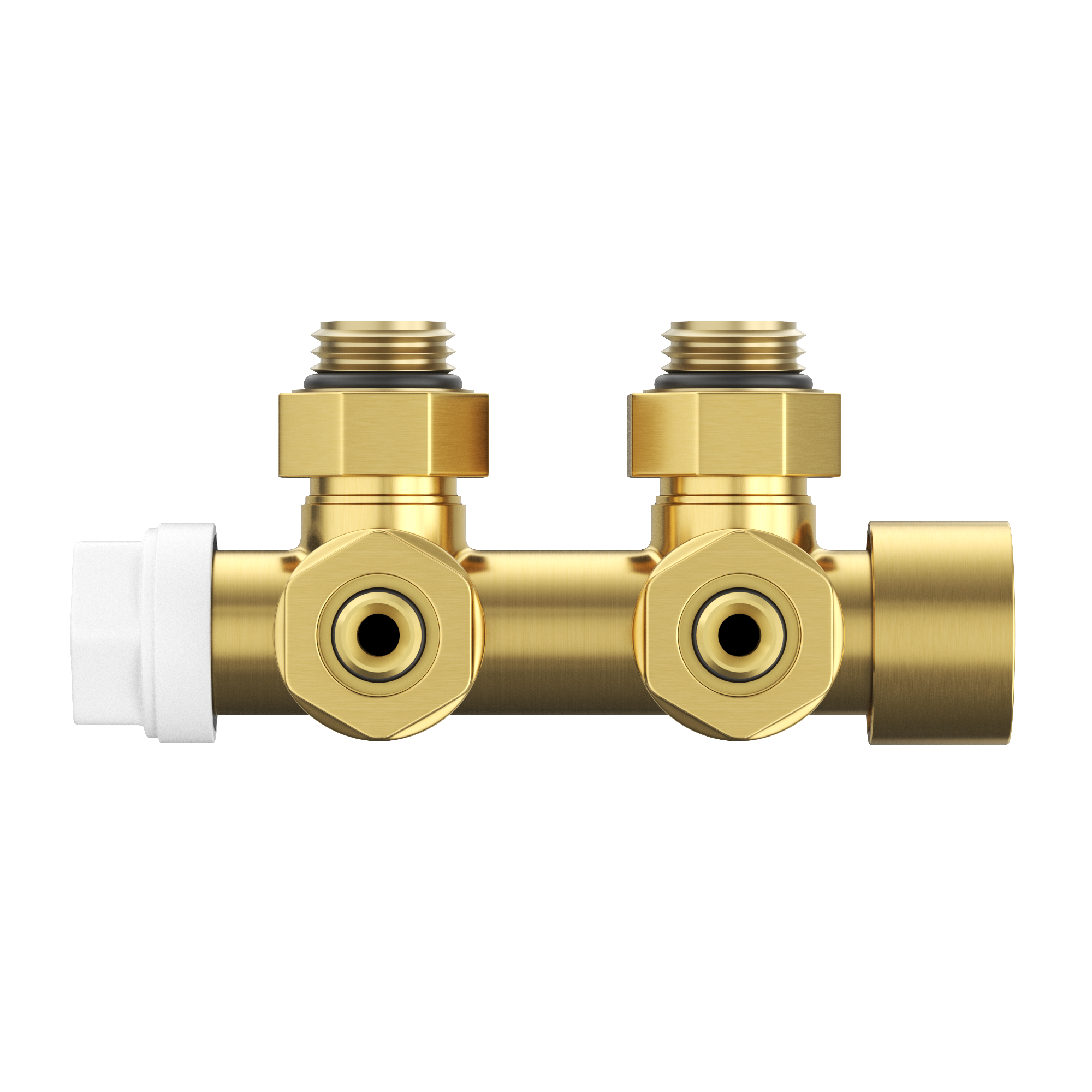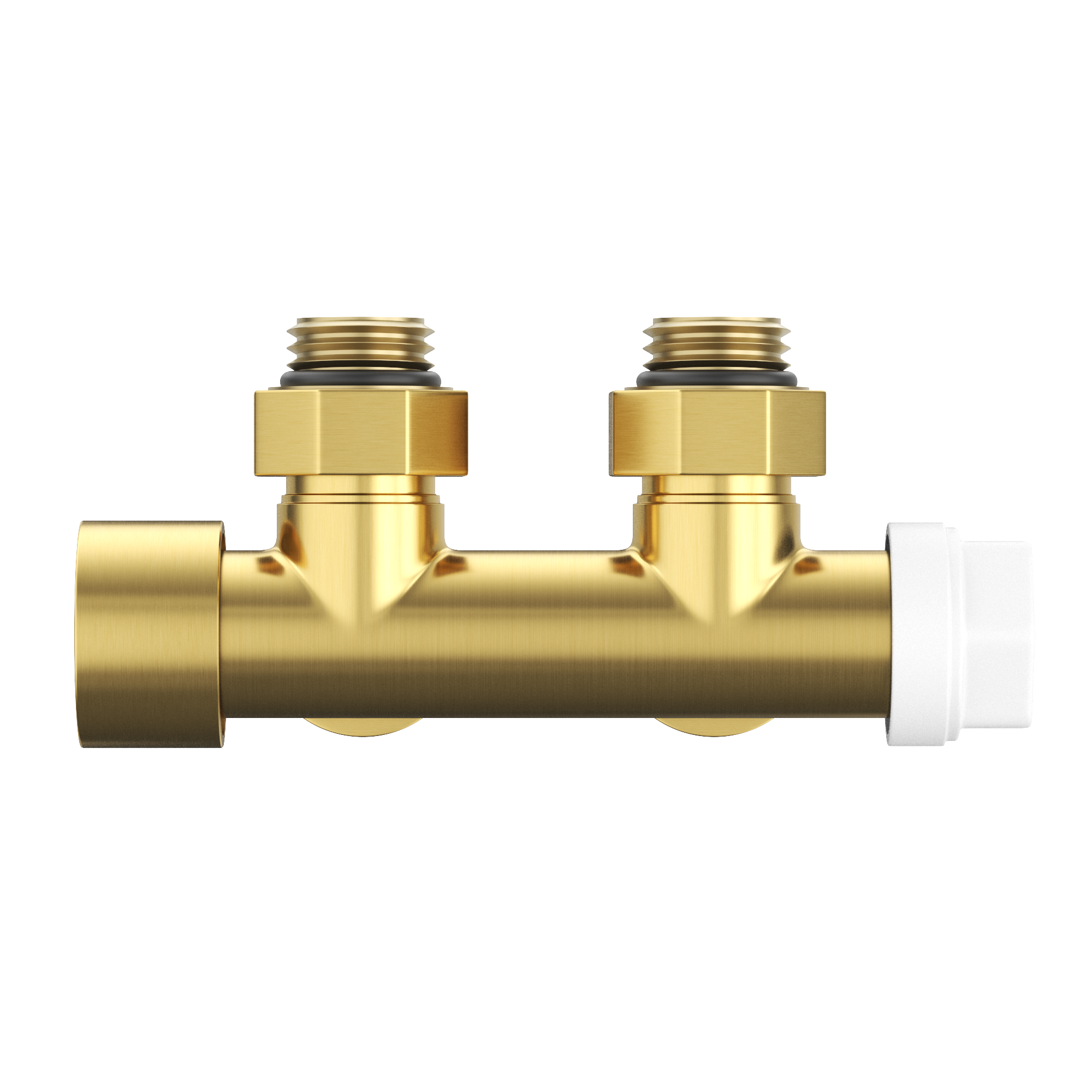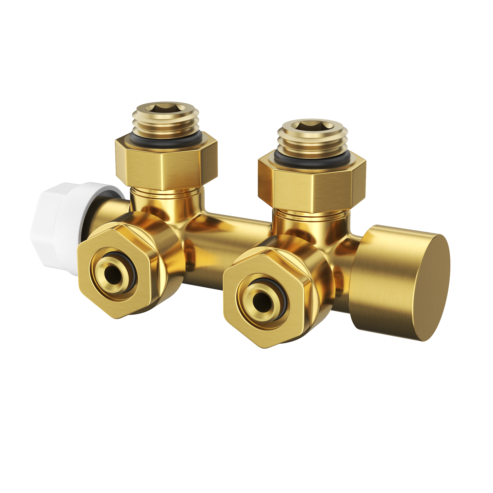 Un robinet modern pentru radiator PEX în finisaj auriu periat ce îmbină durabilitatea, funcționalitatea și designul elegant.