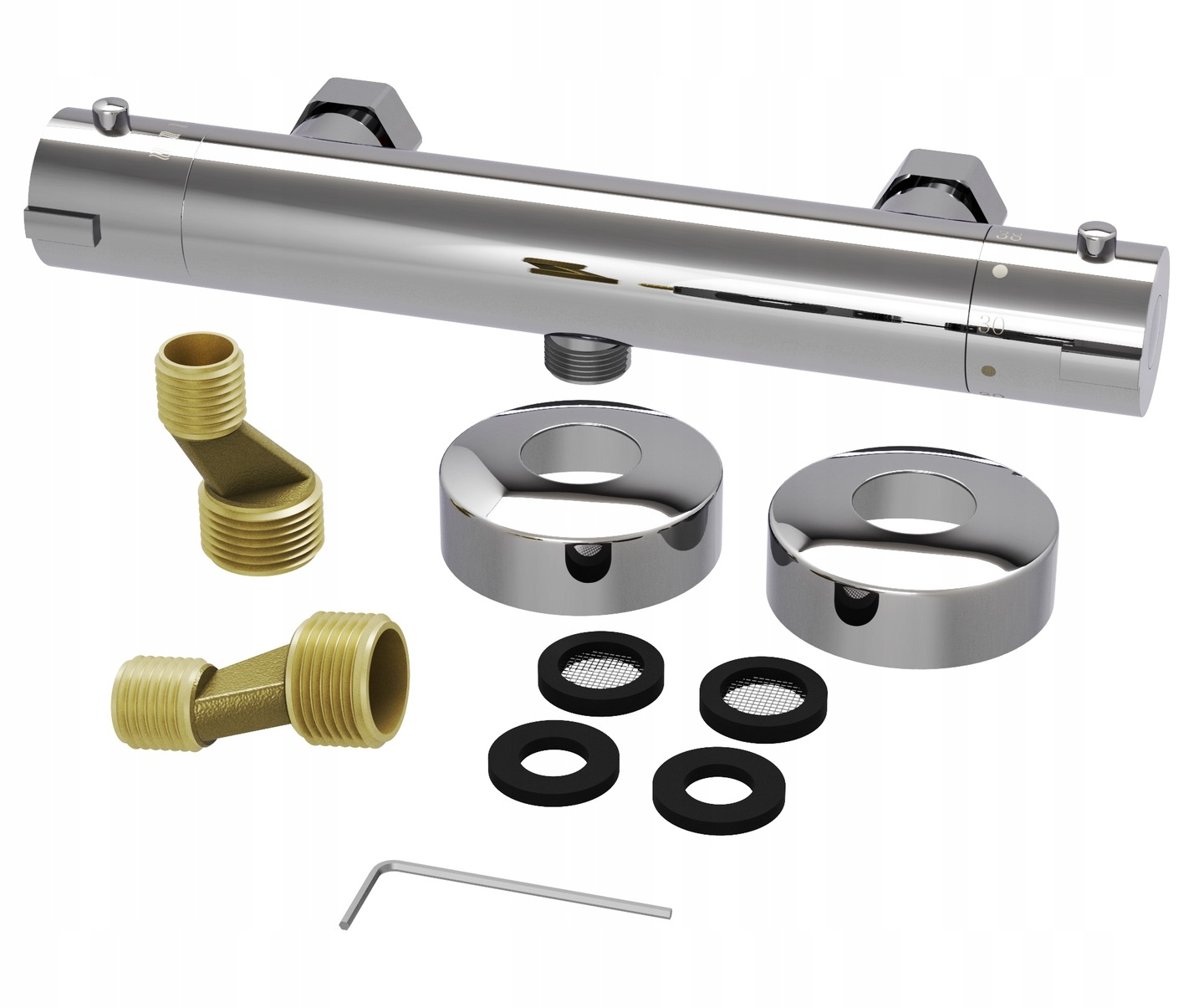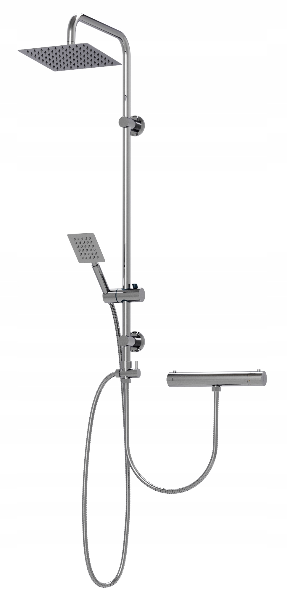 Include: baterie termostatică, duș fix, suport, furtun de duș, pară de duș, comutator, furtun pentru conectarea bateriei