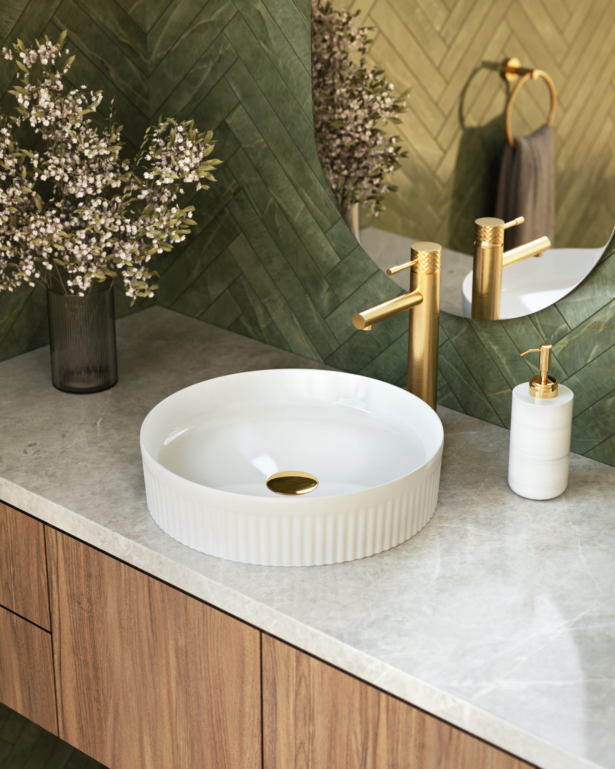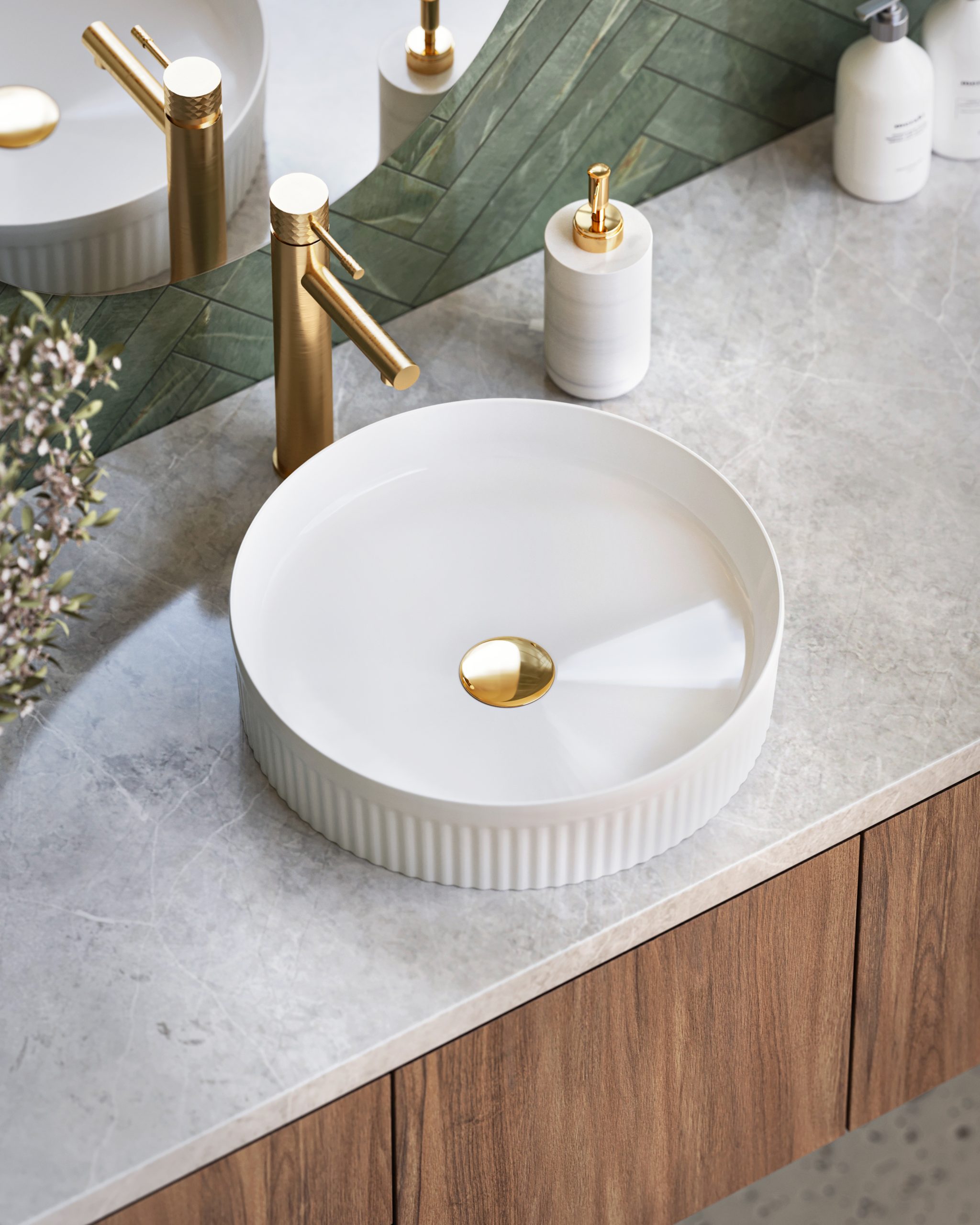 Descoperă ALERA – un lavoar rotund ondulat, montat pe blat, care va transforma baia ta într-un spațiu elegant și confortabil pentru relaxare.