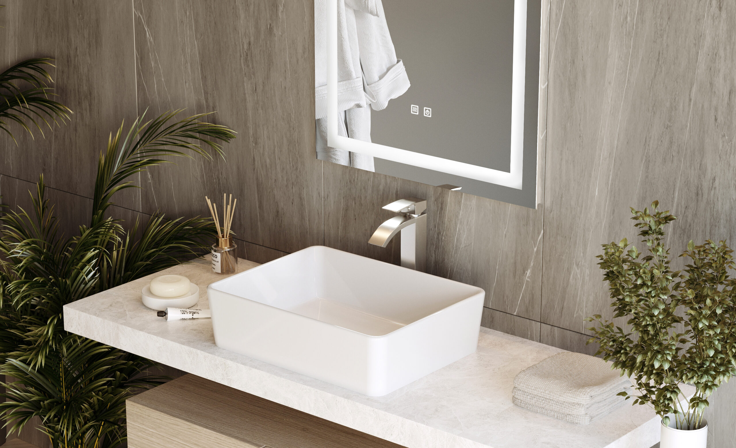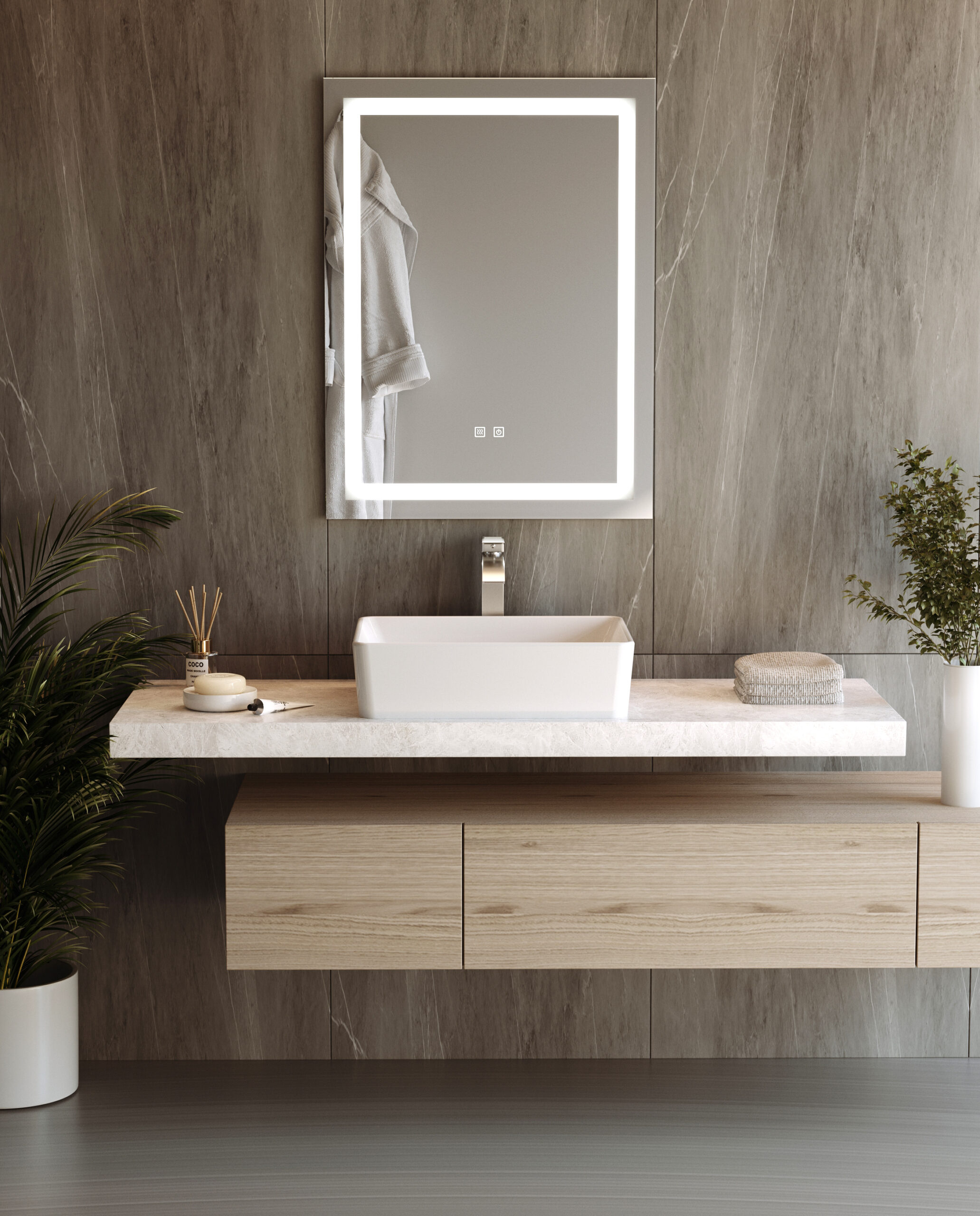 Această oglindă este soluția perfectă pentru cei care caută un element funcțional și estetic pentru baie, combinând confortul utilizării cu eficiența energetică.