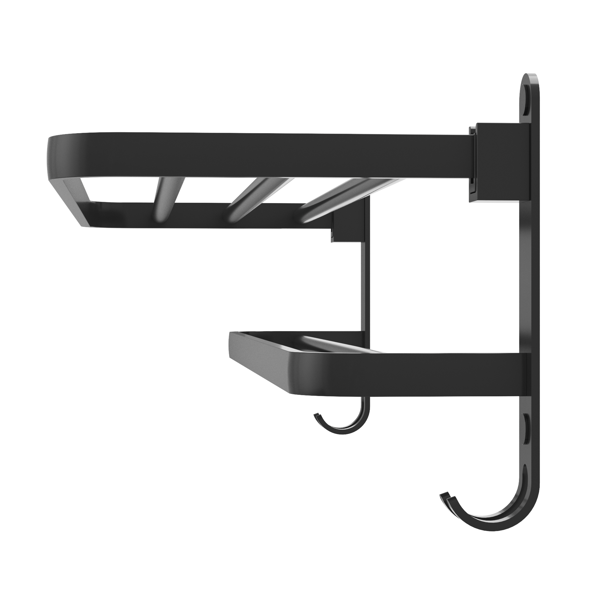 Raftul este finisat în culoarea neagră, care se potrivește perfect cu  băile moderne și elegante. Cârligul suplimentar de pe nivelul inferior permite agățarea obiectelor mai mici, cum ar fi prosoape de mâini sau bureți. Designul său minimalist, dar totodată funcțional face ca acesta să nu doar faciliteze organizarea, ci și să ofere un aspect estetic interiorului.