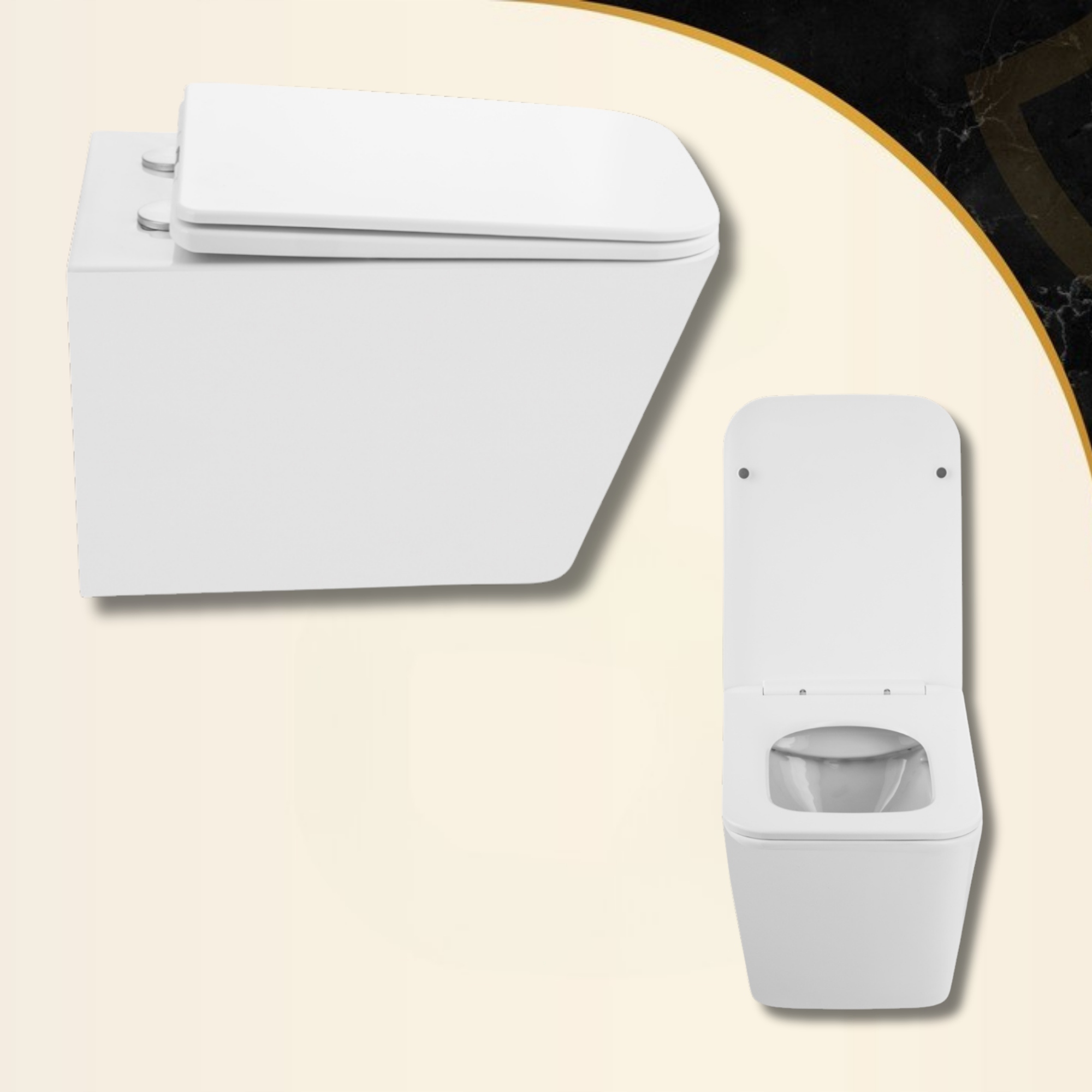 Vas WC elegant, cu un design minimalist, ideal pentru băi. Construcția fără margini facilitează curățarea și asigură igiena. Include un capac silențios cu închidere lentă.