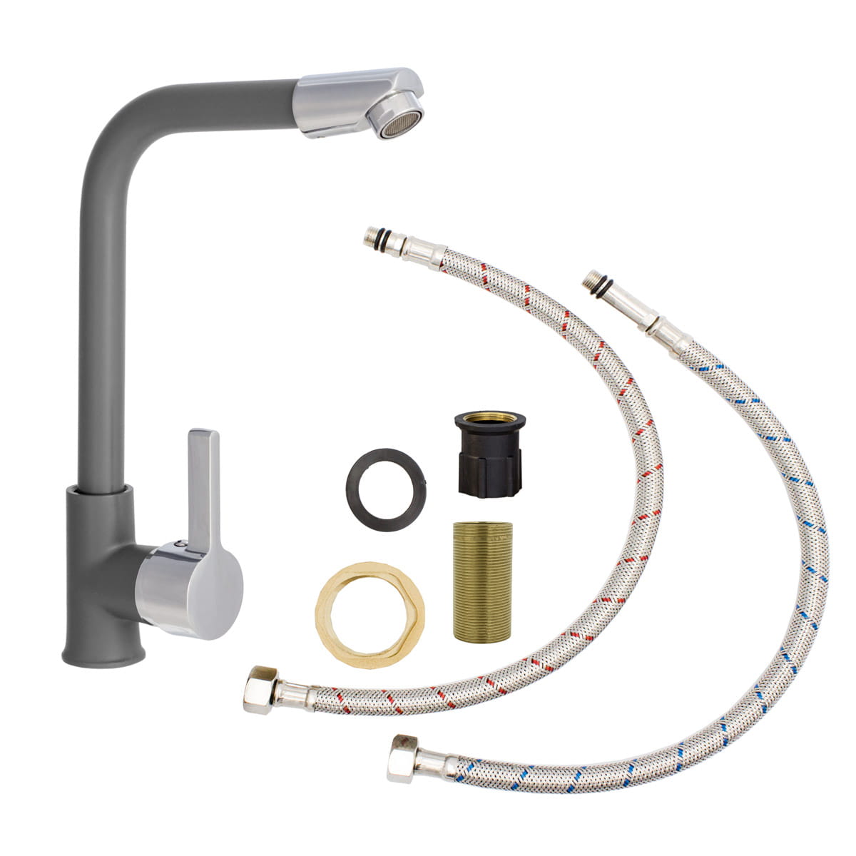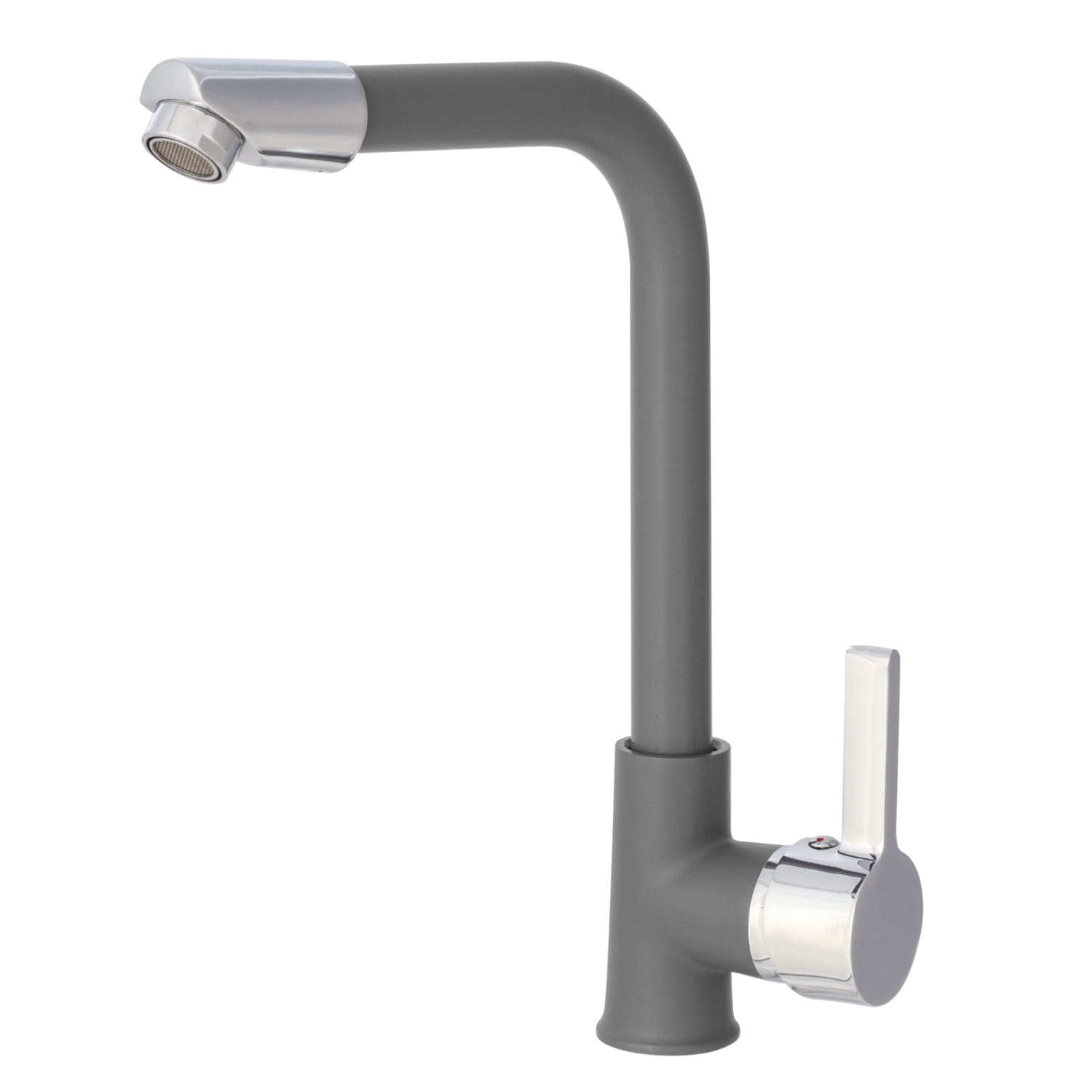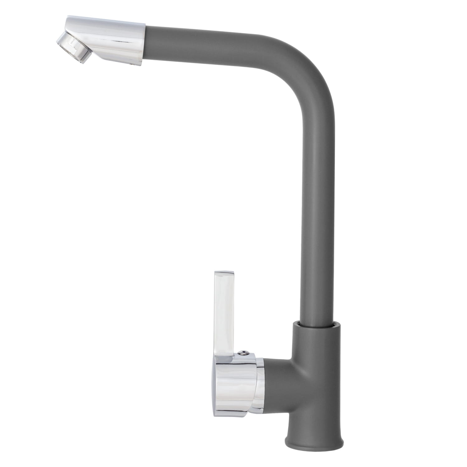 Bateria de bucătărie gri de înaltă calitate, fabricată din alama. Stratul de acoperire al bateriei este rezistent la decolorare și temperaturi ridicate. Cartuș ceramic. Pipa rotativă 360°. Perlator interschimbabil m22. Orificiu standard de montaj 35 mm.