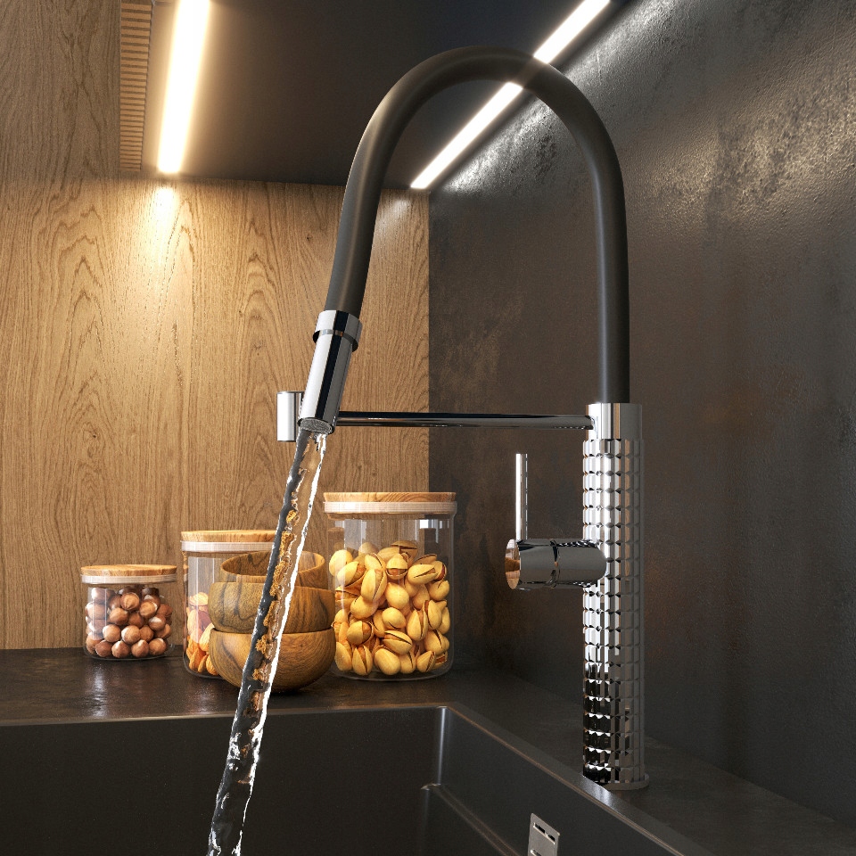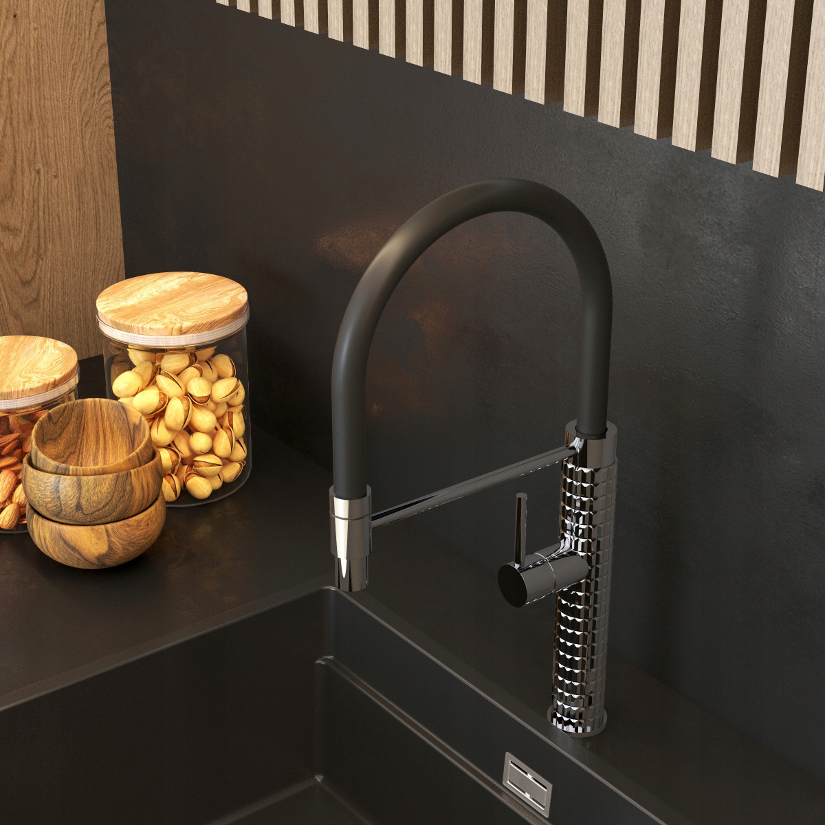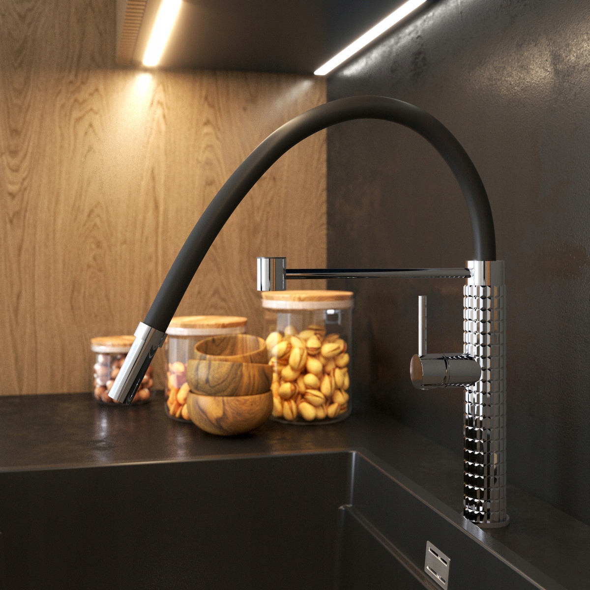 Fano este un robinet inovator de bucătărie cu o pipă flexibilă. Ergonomia bateriei asigură un confort deosebit în timpul activităților zilnice din bucătărie.