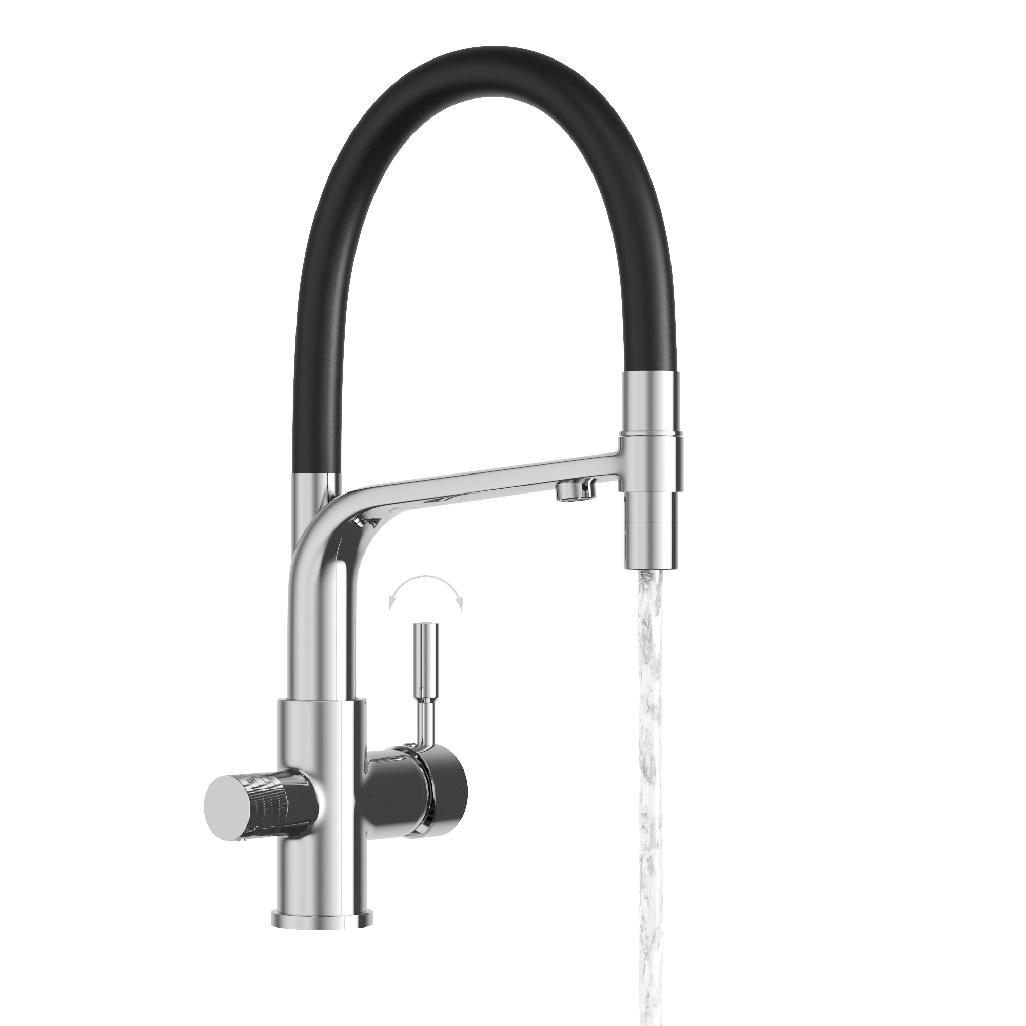 Bateria tridirecțională MALTA este o soluție care permite utilizarea apei reci, calde și filtrate într-un singur loc. Datorită celor trei circuite independente de apă, elimină necesitatea instalării unui robinet suplimentar pe blat, ceea ce se traduce printr-o funcționalitate și estetică superioare bucătăriei. Concepția sa bine gândită și atenția la detalii fac utilizarea confortabilă, iar instalarea rapidă și lipsită de complicații.