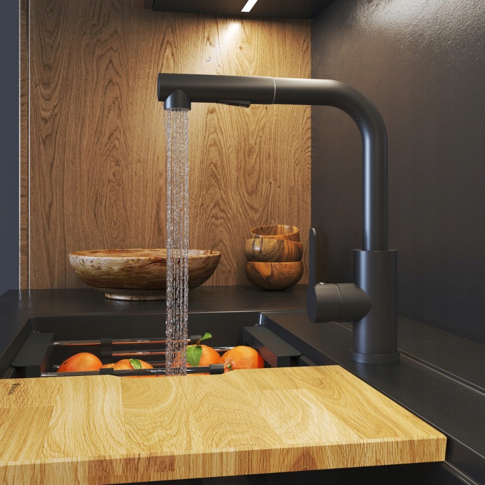 Ebro este un tip de baterie pentru chiuveta de bucătărie echipată cu un gura de scurgere specifică, care poate fi extrasă din suport și utilizată ca duș. Aceasta permite orientarea facilă a fluxului de apă în diverse direcții și locații, ceea ce este deosebit de important și util în bucătărie.