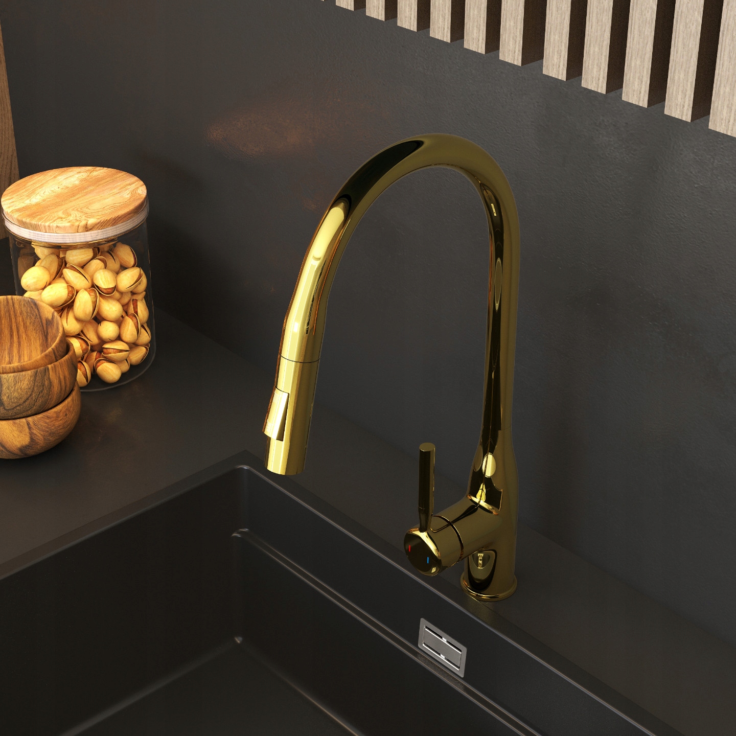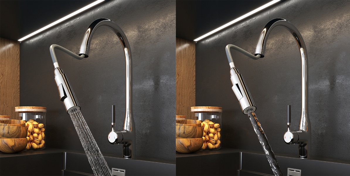 Robinetul este echipat cu o gură de scurgere rotativă și extractibilă, precum și cu un duș dublu funcțional(jet de apă standard sau duș), care fac mult mai ușoare sarcinile zilnice de bucătărie.