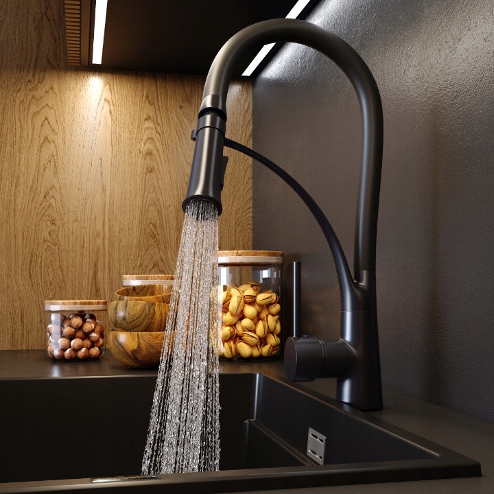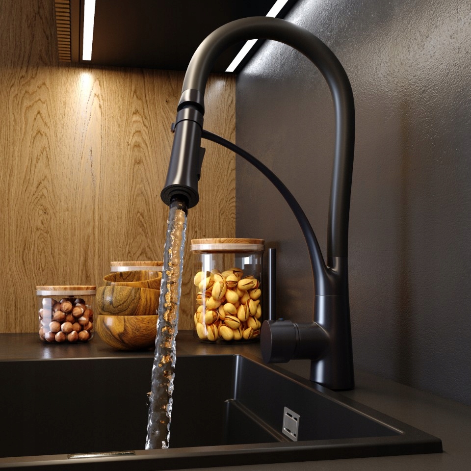 Bateria de bucătărie NEXO cu duză extensibilă și telefon cu două funcții NEAGRĂ
