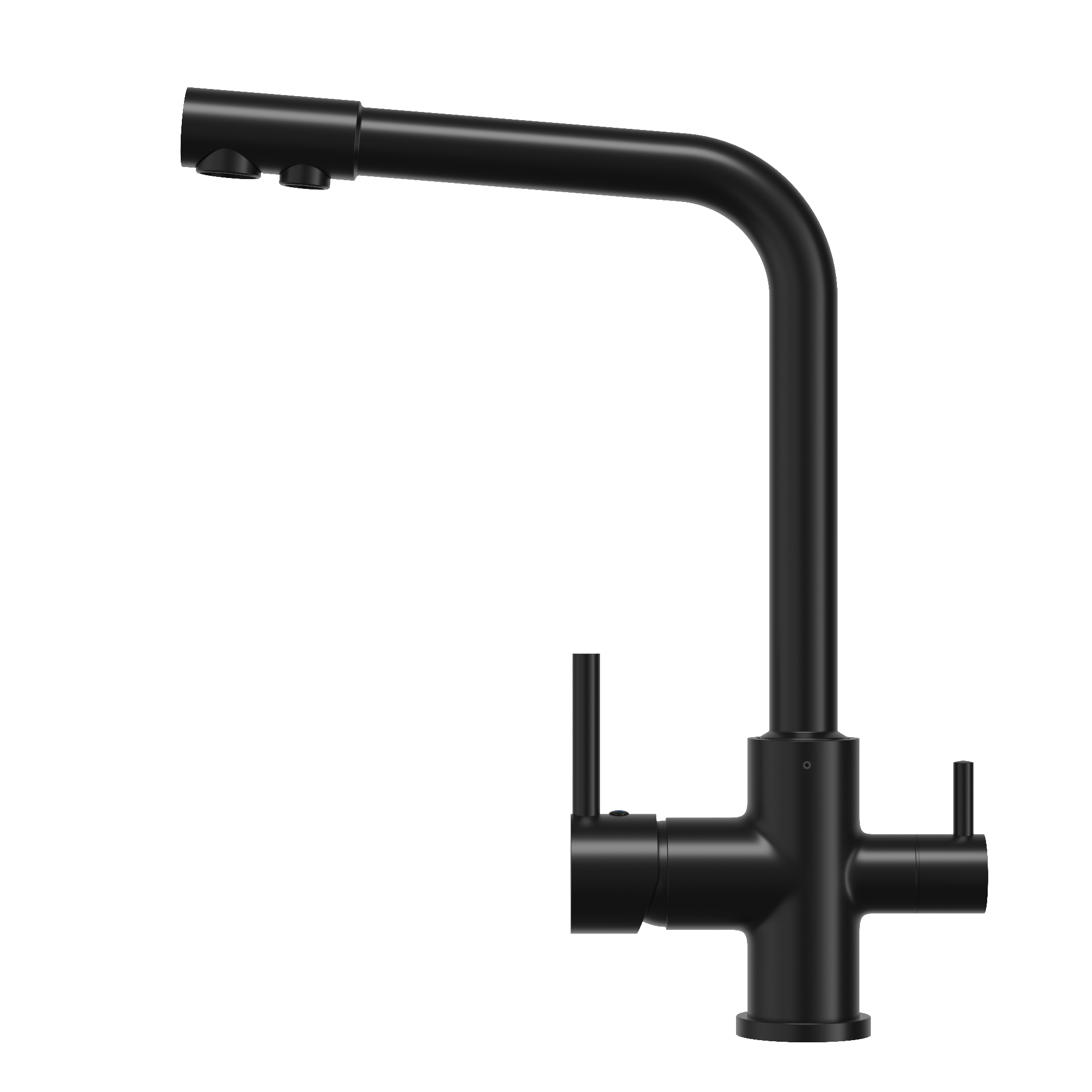 Modernă baterie de bucătărie cu trei căi în finisaj elegant negru mat care îmbină funcționalitatea cu designul stilat. Ideală pentru bucătăriile moderne, unde estetica și confortul sunt prioritare.