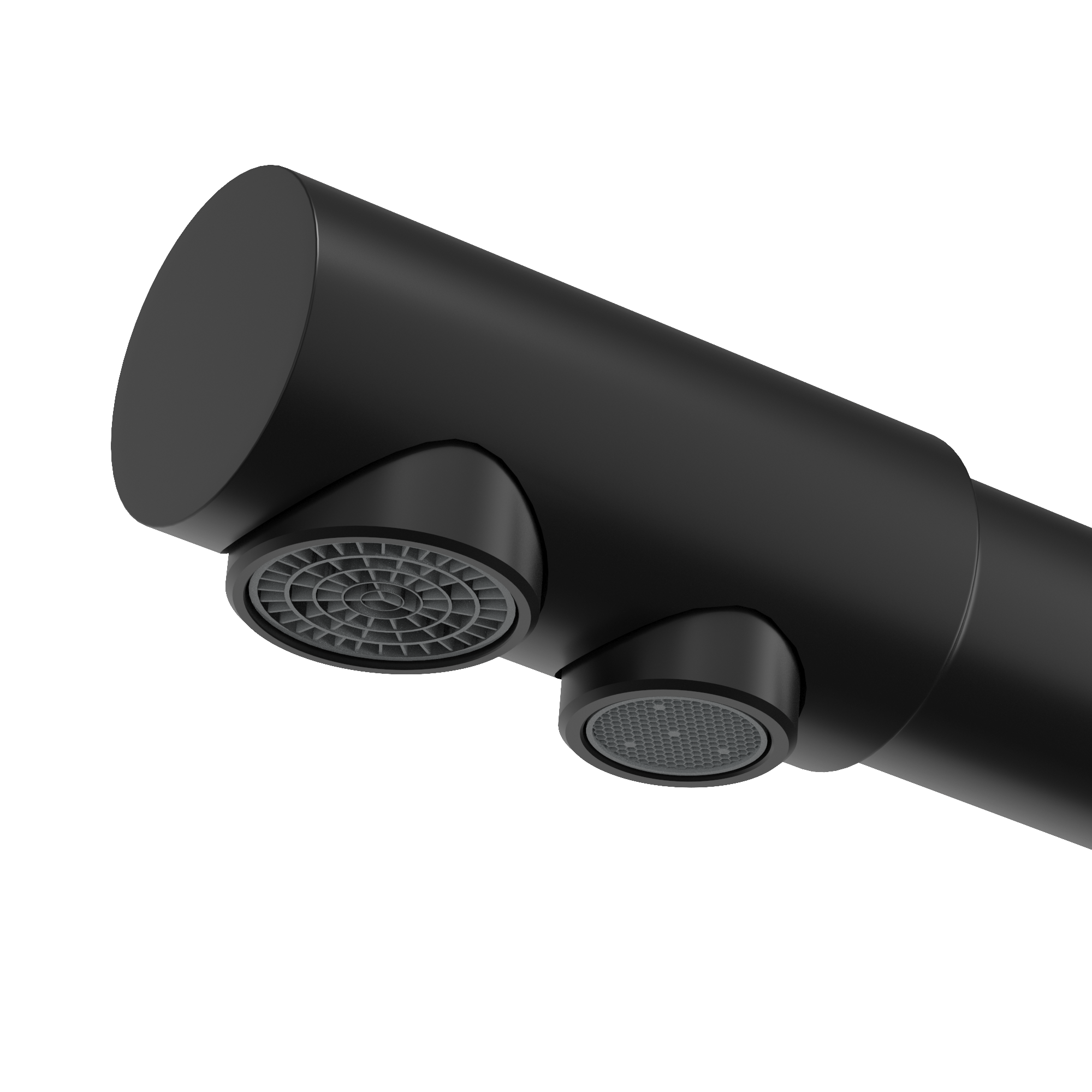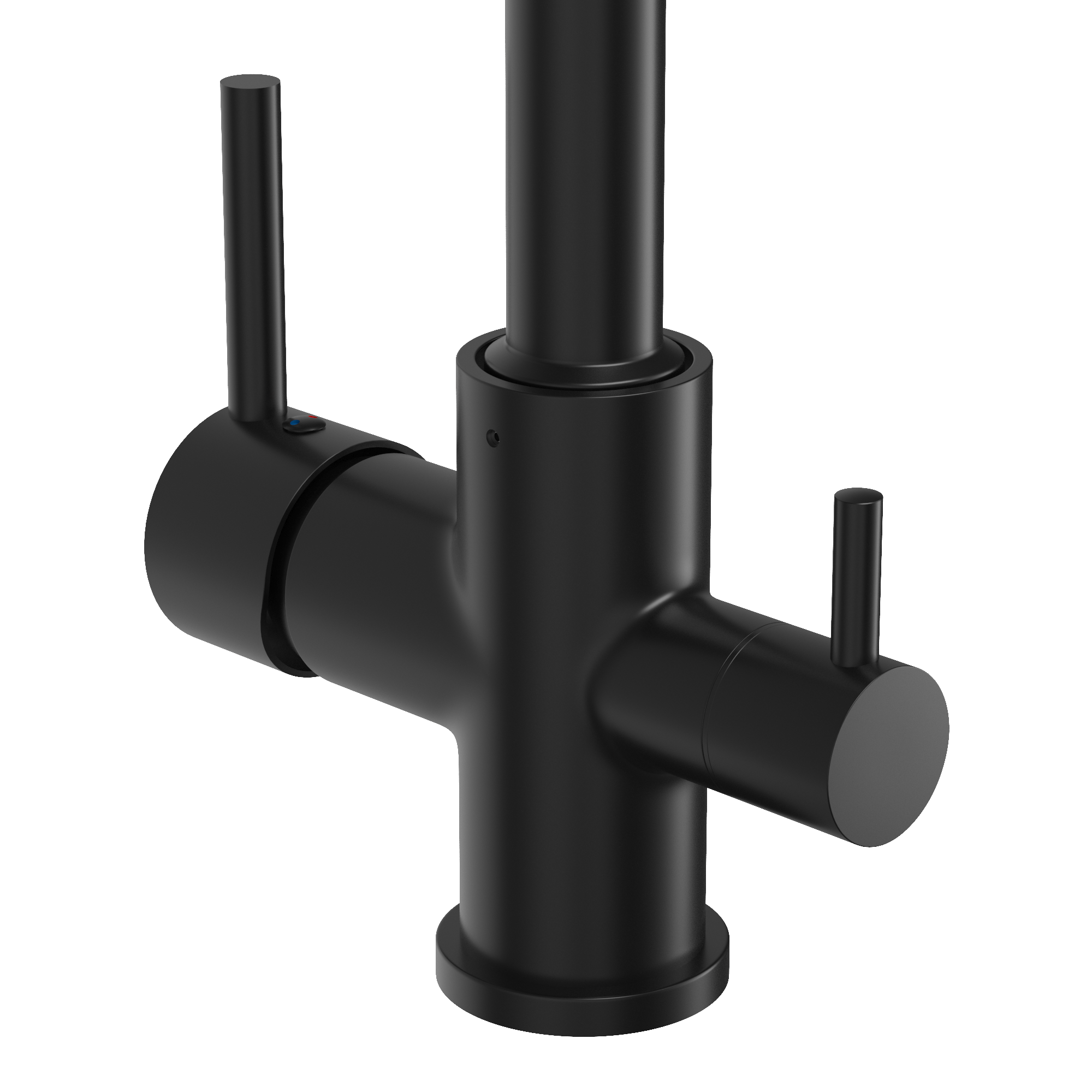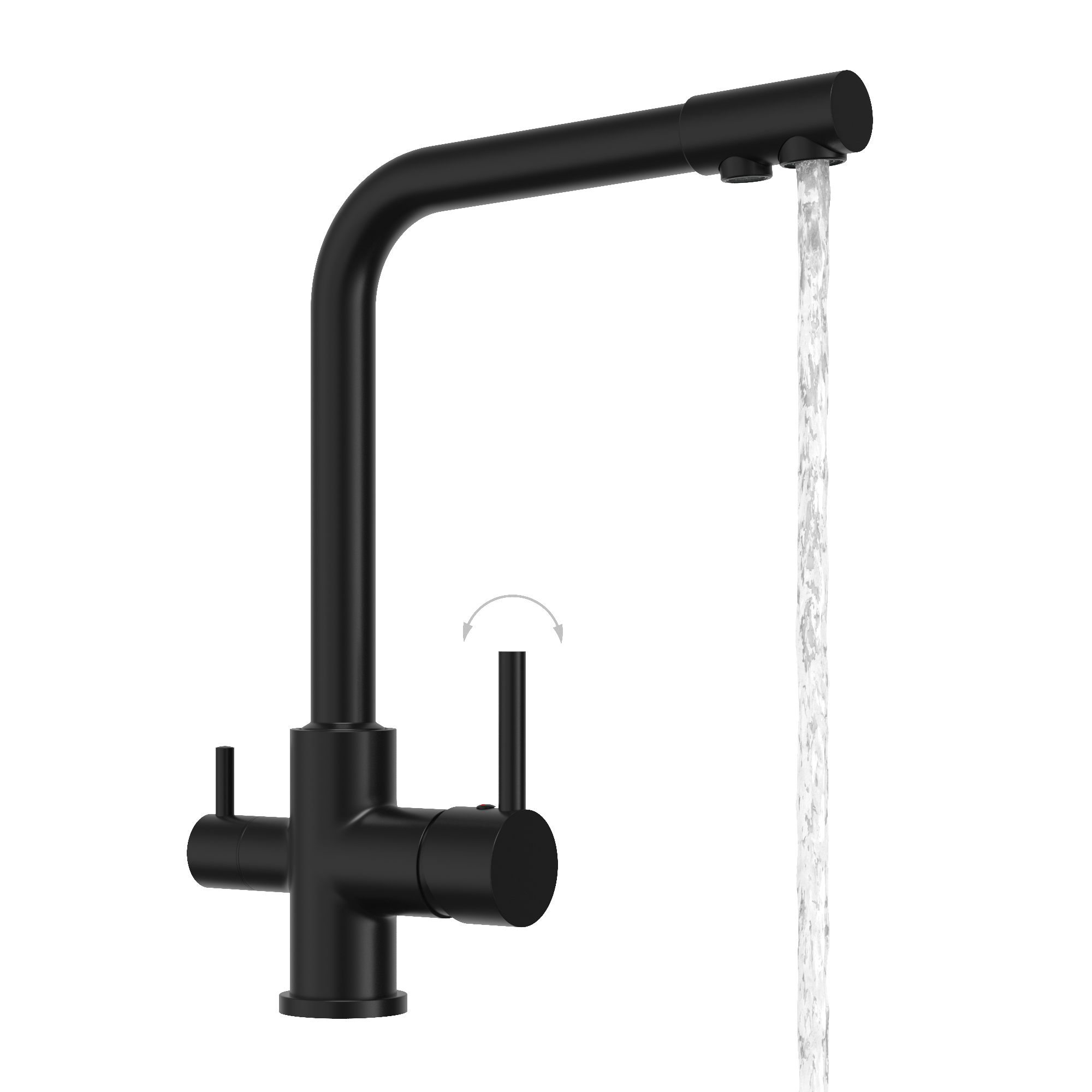 Modernă baterie de bucătărie cu trei căi în finisaj elegant negru mat care îmbină funcționalitatea cu designul stilat. Ideală pentru bucătăriile moderne, unde estetica și confortul sunt prioritare.