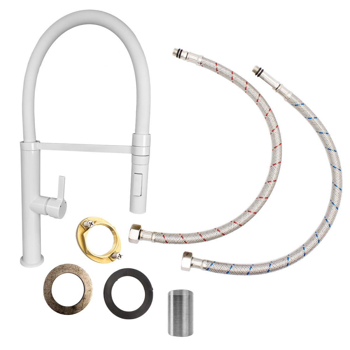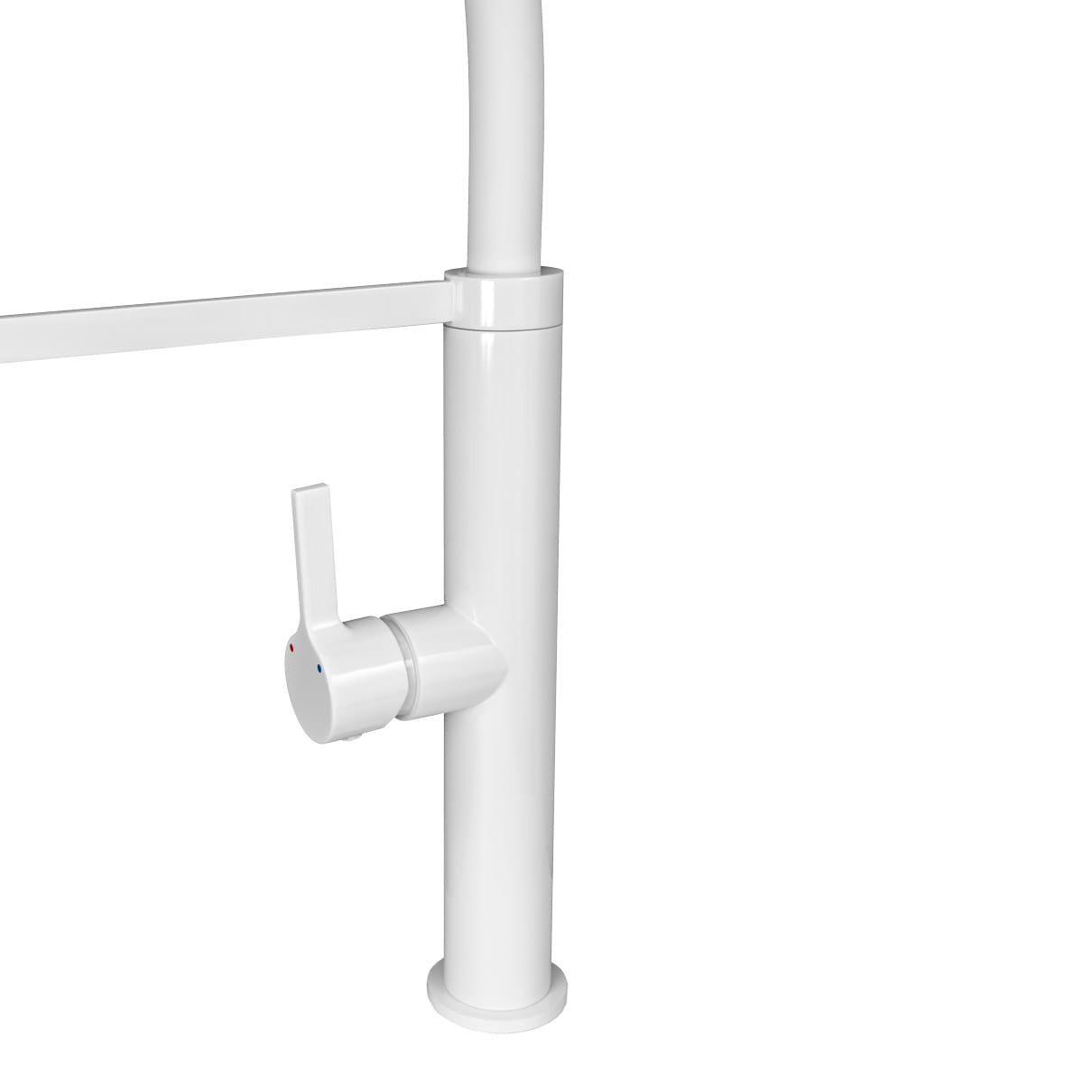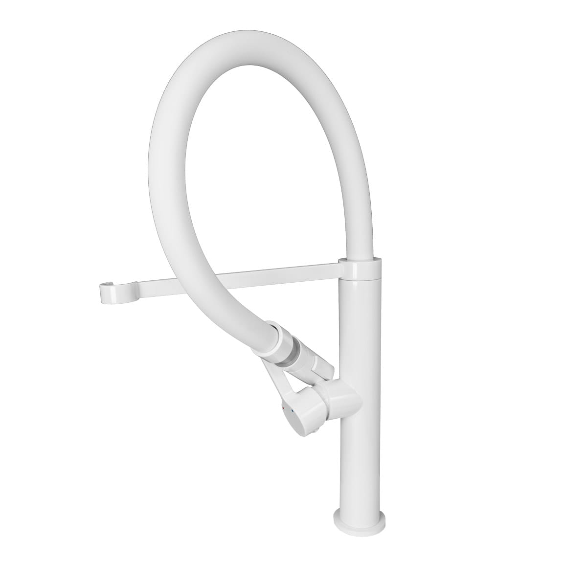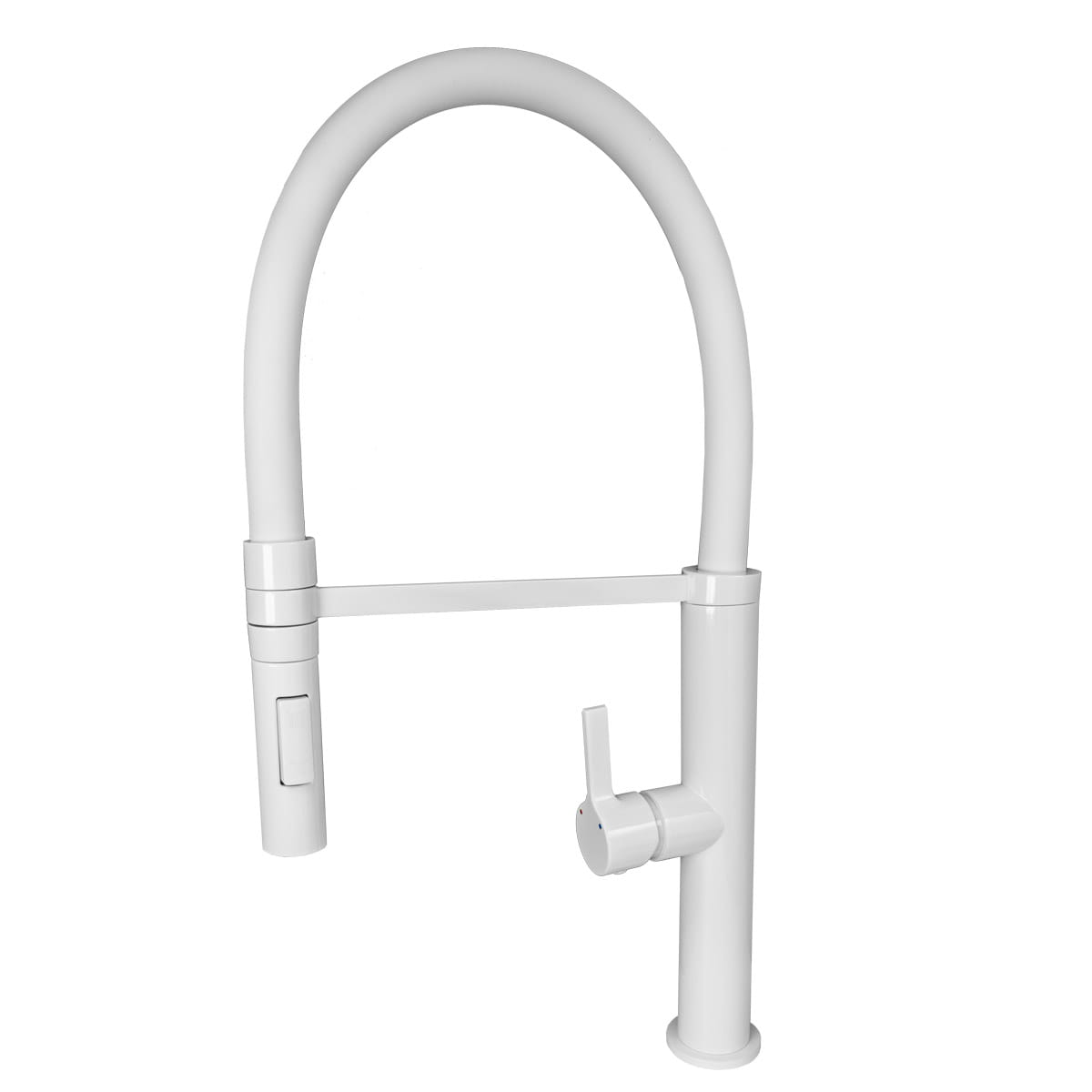 Bateria de bucătărie FUSS de înaltă calitate, realizată din alamă, de culoare albă. Acoperirea bateriei este rezistentă la decolorare și temperaturi ridicate, cu cartuș ceramic. Orificiu de montaj standard 35 mm. Dușul dublu-funcțional (două tipuri de jet de apă), cu pipă rotativă 360°, extensibilă.