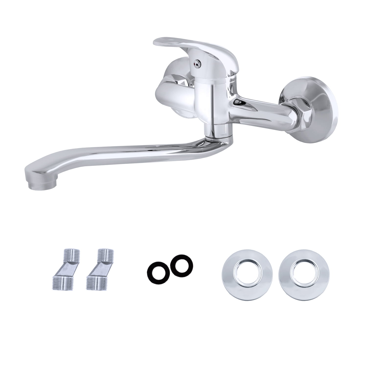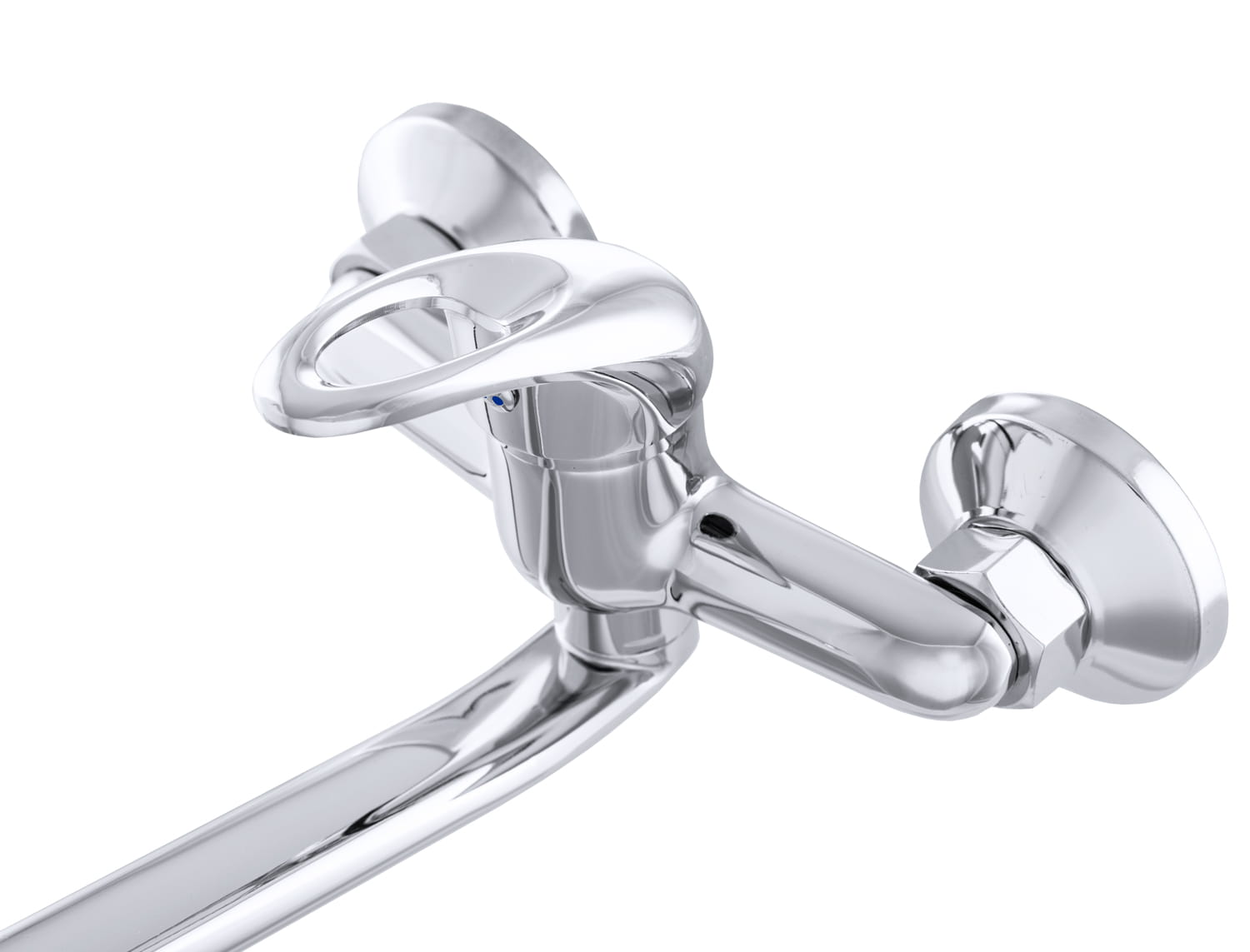 Baterie de bucătărie și lavoar montată pe perete DAX de calitate superioară, fabricată din alamă, în finisaj cromat/luciu înalt. Stratul de acoperire al bateriei este rezistent la decolorare și temperaturi ridicate. Cartuș ceramic de 35 mm. Pipă pivotantă 360°. Perlatoare M24 ECO cu aerator interschimbabil. Distanța standard între racorduri este de 150 mm.
