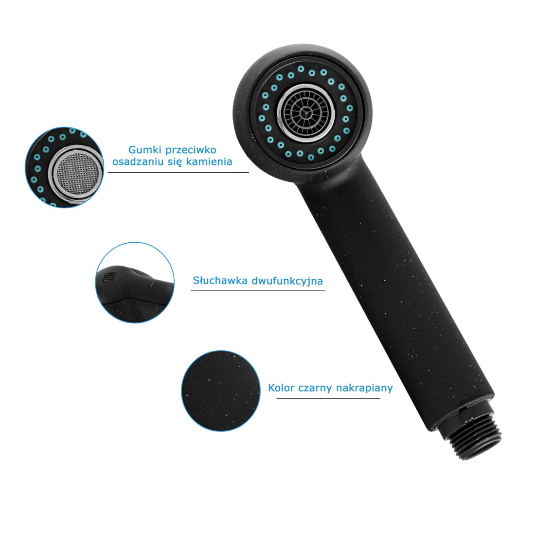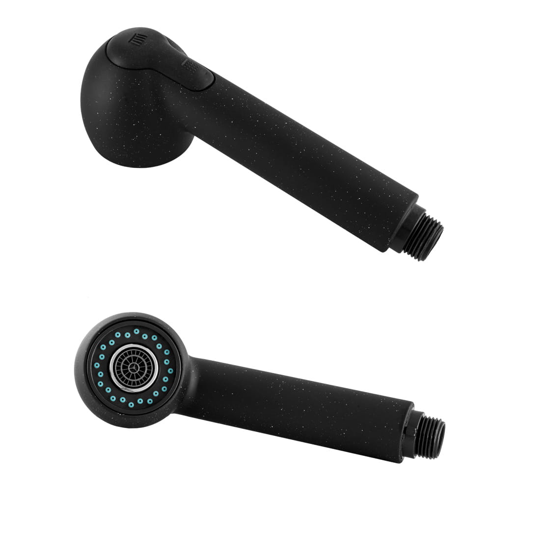 Telefon de bucătărie pentru baterie cu duză retractabilă, realizat din material PVC, de culoare negru cu particule. Două funcții pentru jetul de apă (duș și constant). Filet standard 1/2''. Suprafața telefonului este rezistentă la decolorare și temperaturi ridicate. Gume anti-depunere a calcarului. Compatibil cu orice furtun de bucătărie cu racord de 1/2''.
