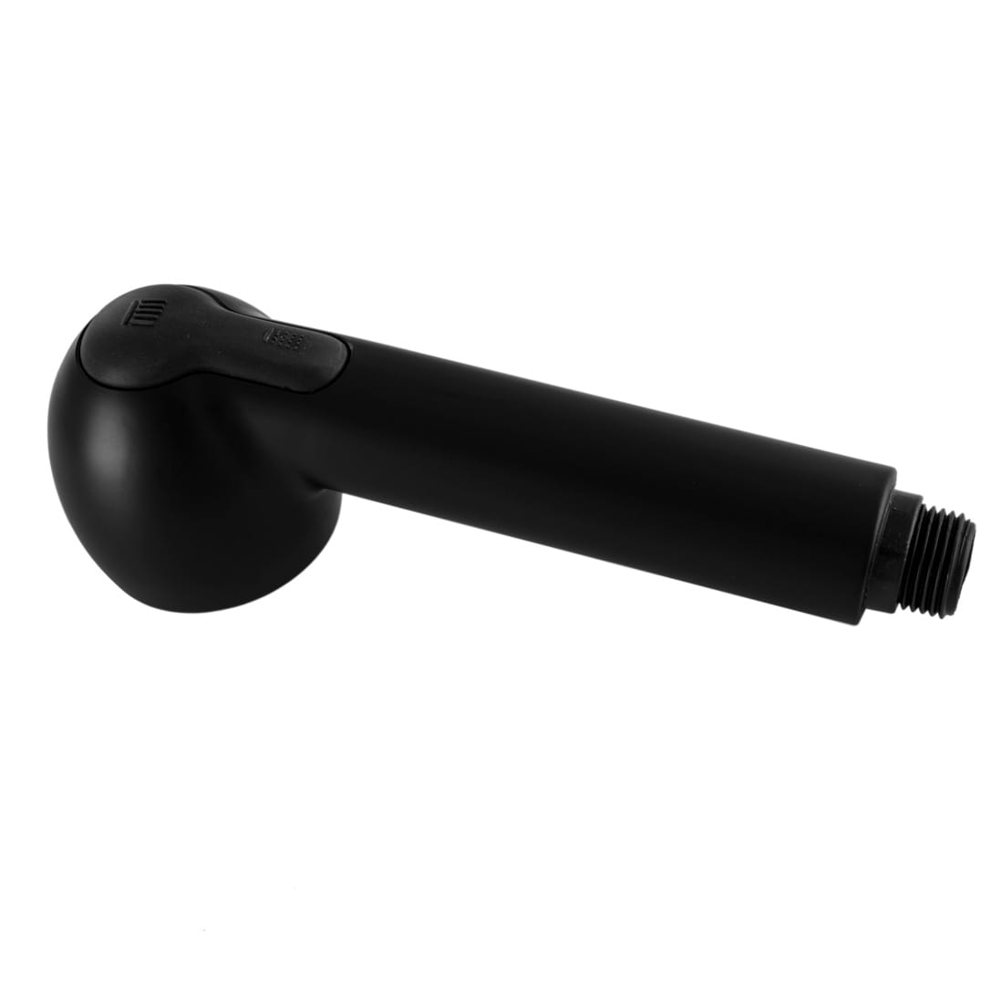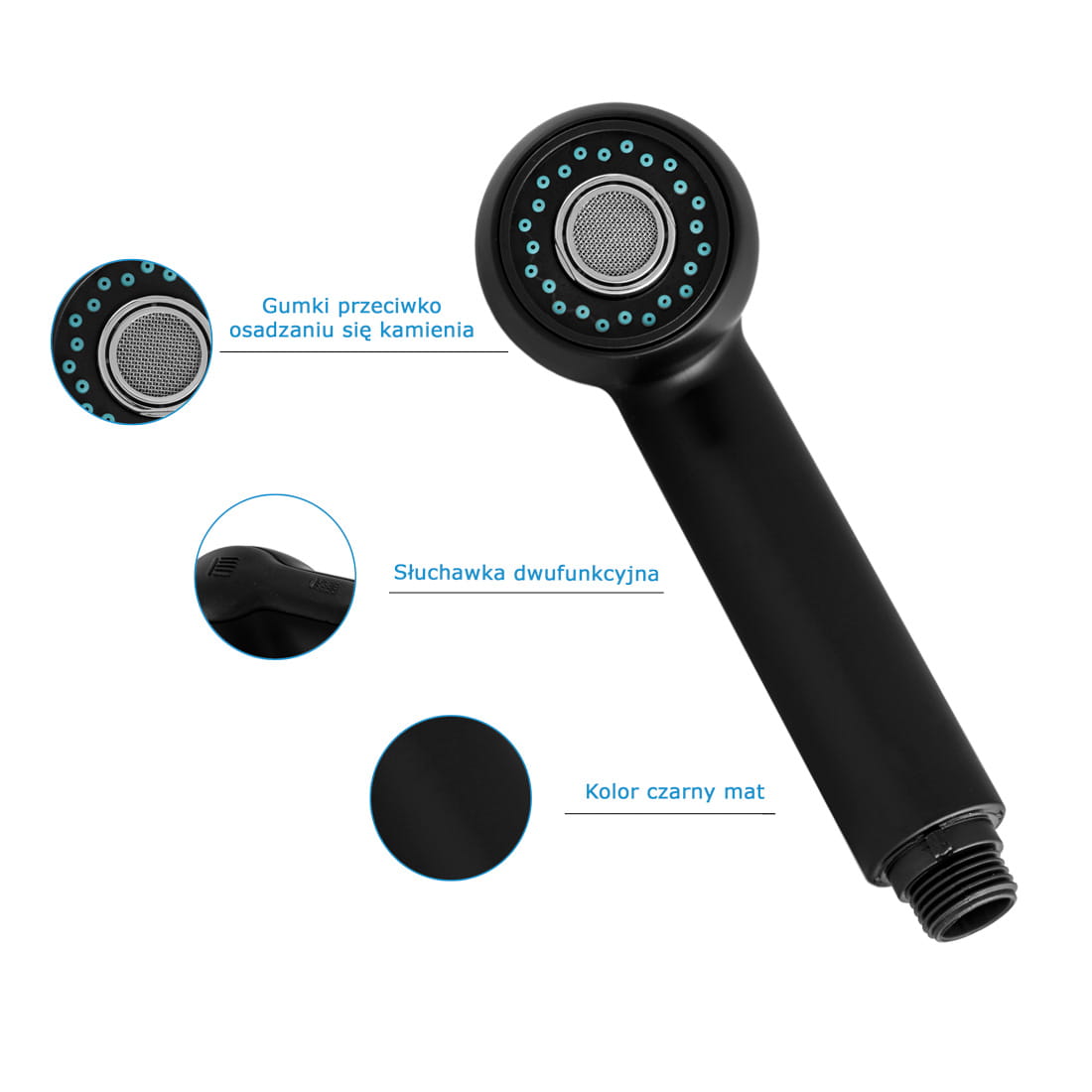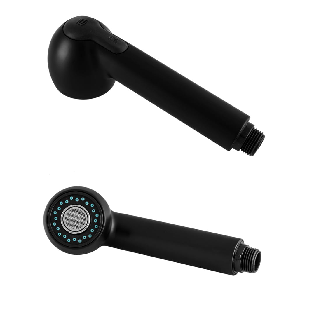 Cap de duș pentru baterie de bucătărie cu furtun extensibil, fabricat din material PVC, în culoarea neagră. Două funcții ale jetului de apă (duș și continuu). Filet standard de 1/2''. Suprafața capului de duș este rezistentă la decolorare și temperaturi înalte. Garnituri de cauciuc anti-depunere calcar. Compatibil cu orice furtun de bucătărie cu racord de 1/2''.