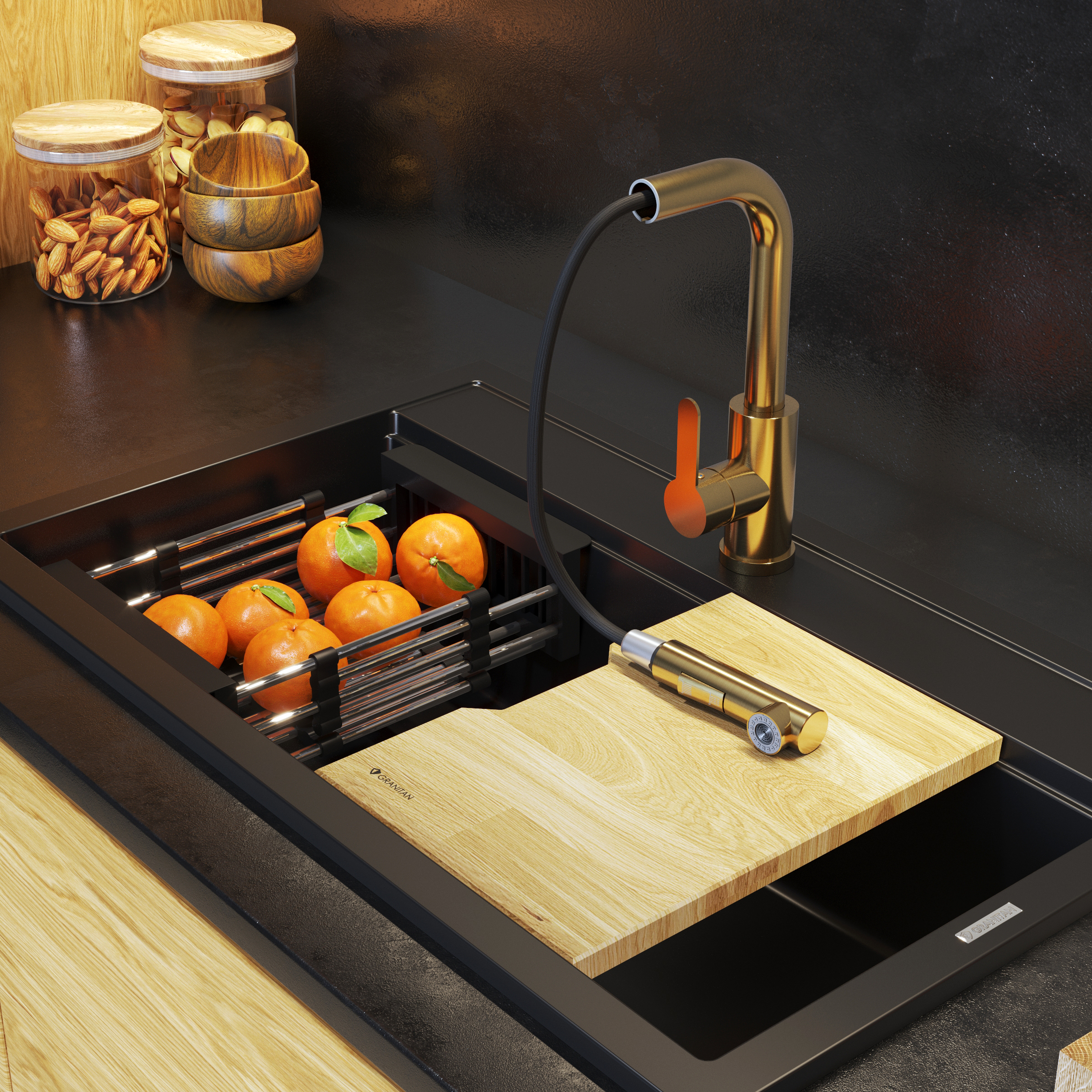 BATERIE DE BUCĂTĂRIE AURIE GOLD CU PIPĂ EXTENSIBILĂ 2 JETURI PENTRU CHIUVETĂ EBRO