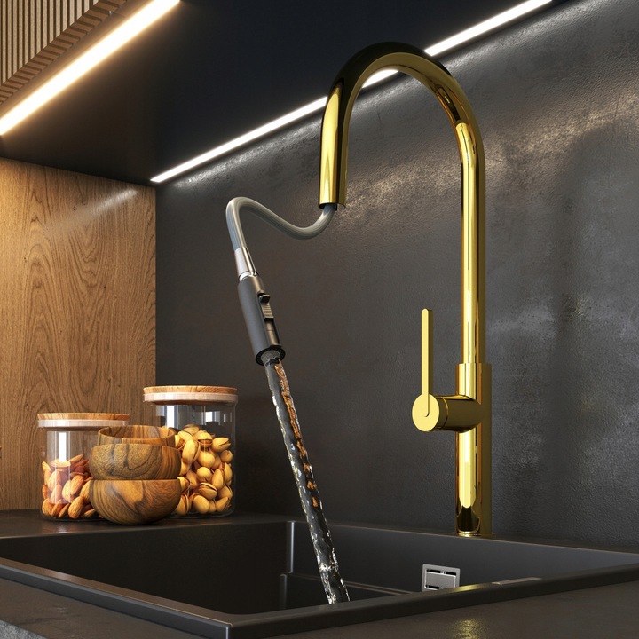 Bateria este prevăzută cu o gură de scurgere extractibilă și rotativă, precum și un duș bidirecțional (jet standard sau duș), care fac mult mai ușoare activitățile zilnice din bucătărie.