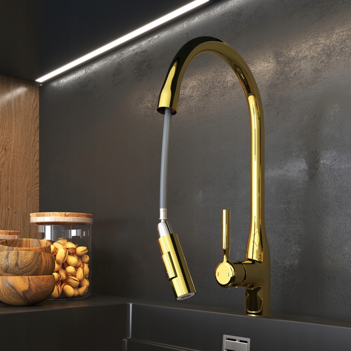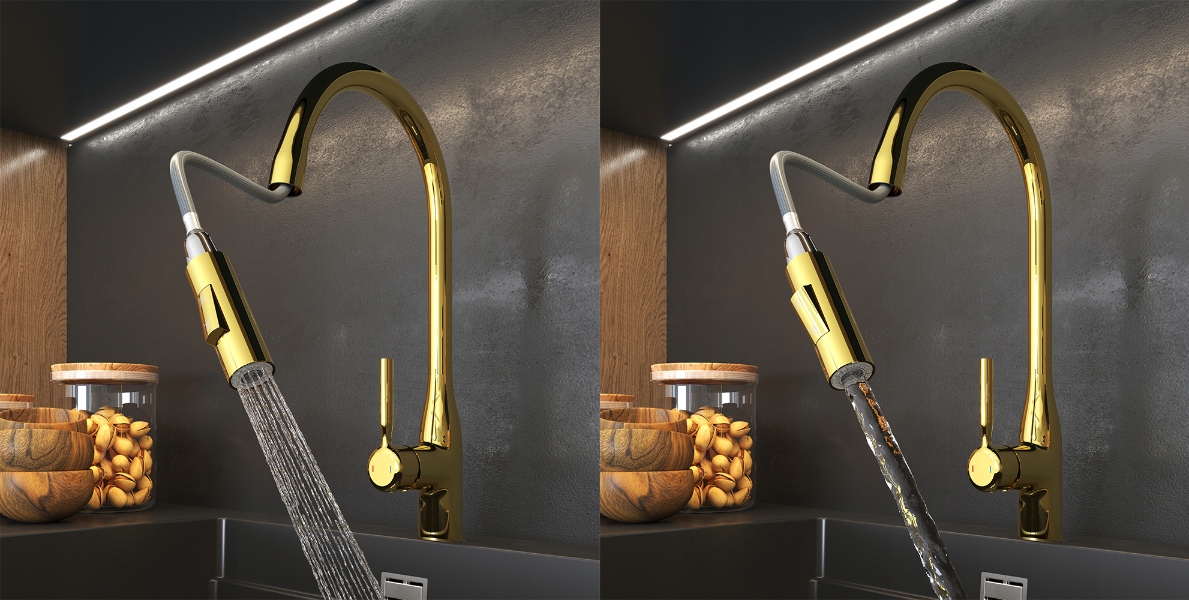 BATERIA DE BUCĂTĂRIE CU DUS EXTRACTIBIL AURIE ROBINET BIFUNCȚIONAL MODERN FOSSA