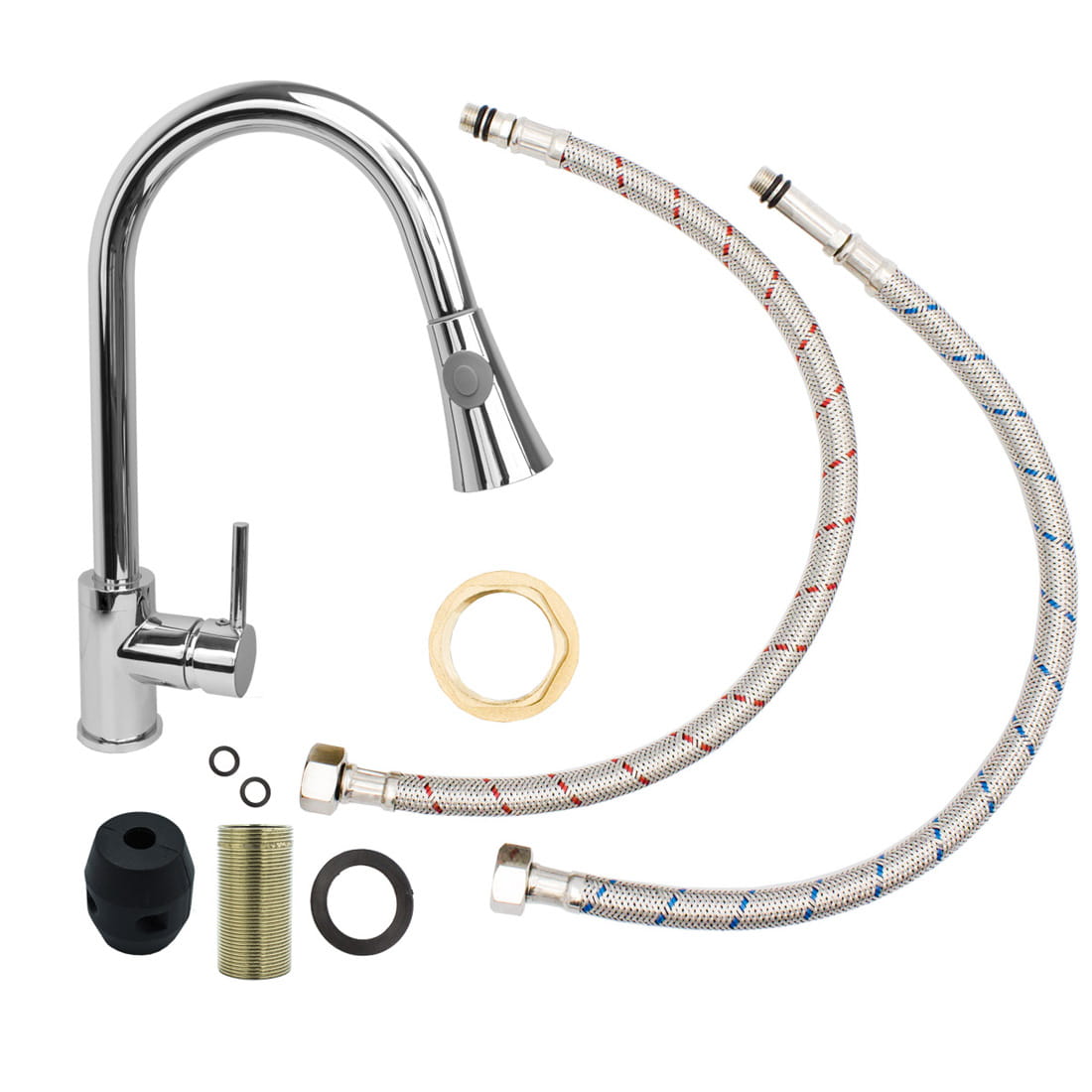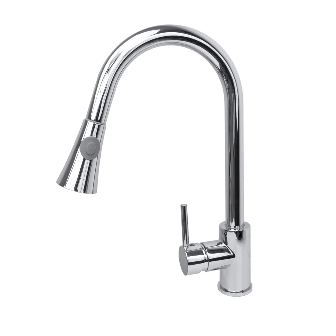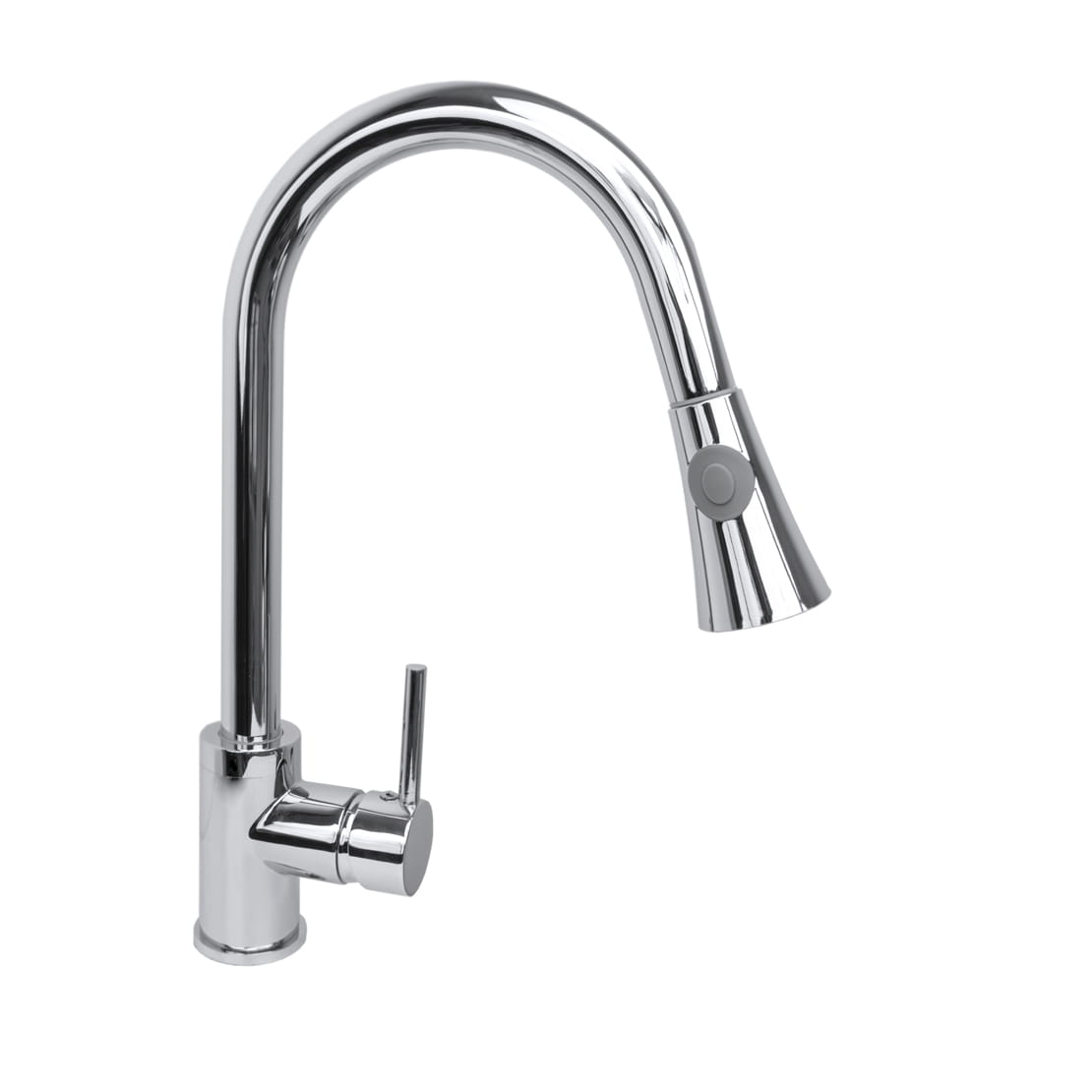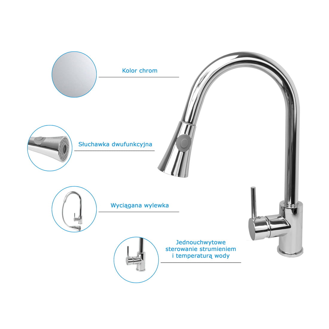 Bateria de bucătărie TARU cu pipă extensibilă de înaltă calitate, fabricată din alamă, în finisaj cromat. Suprafața bateriei este rezistentă la decolorare și temperaturi ridicate. Cartuș ceramic 40 mm. Rotativă la 360°, pipă extensibilă. Para de duș cu două funcții (două tipuri de jet de apă). Orificiu de montare standard 35 mm.