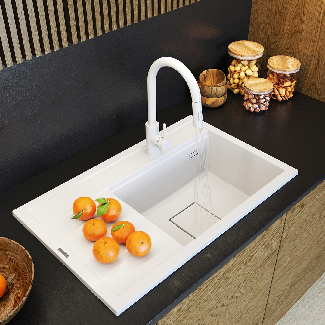 Această soluție subtilă face ca chiuveta să iasă în evidență față de concurență și adaugă un element interesant și inesperat în bucătărie. Accesoriul îmbunătățește, de asemenea, valoarea estetică a modelului, contribuind la un design stilat al spațiului bucătăriei.