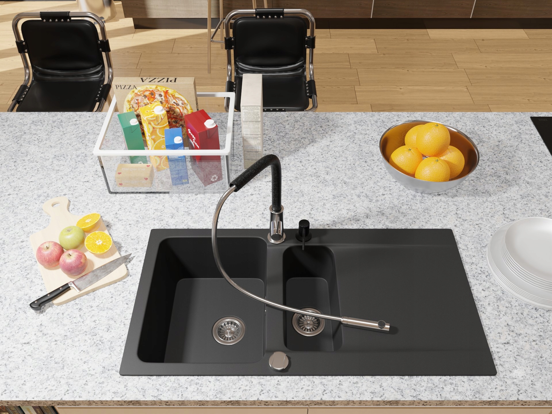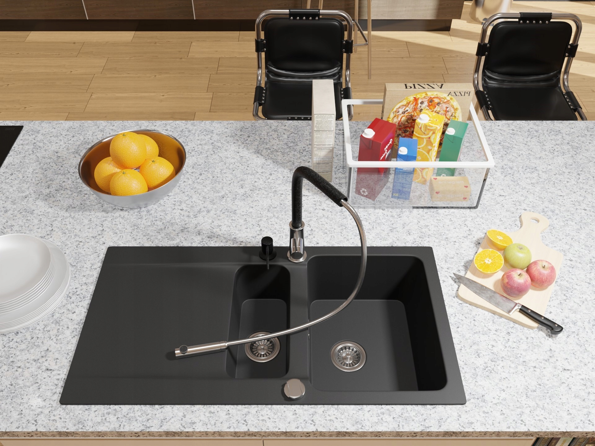 Conținutul setului: chiuvetă, baterie, dozator, sifon, țevi, cleme de fixare