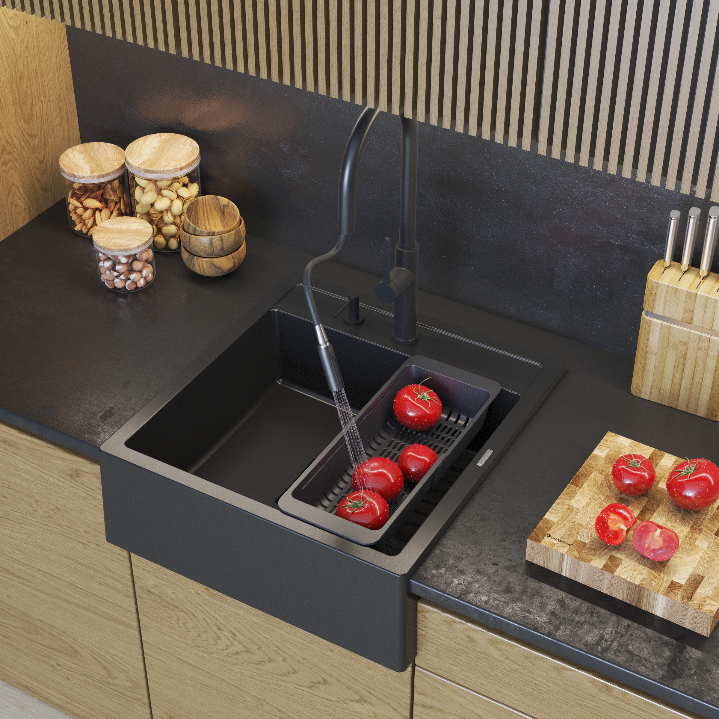 Model rotund realizat din material plastic durabil care se integrează perfect în suprafața chiuvetei și completează aspectul vizual al spațiului din bucătărie.