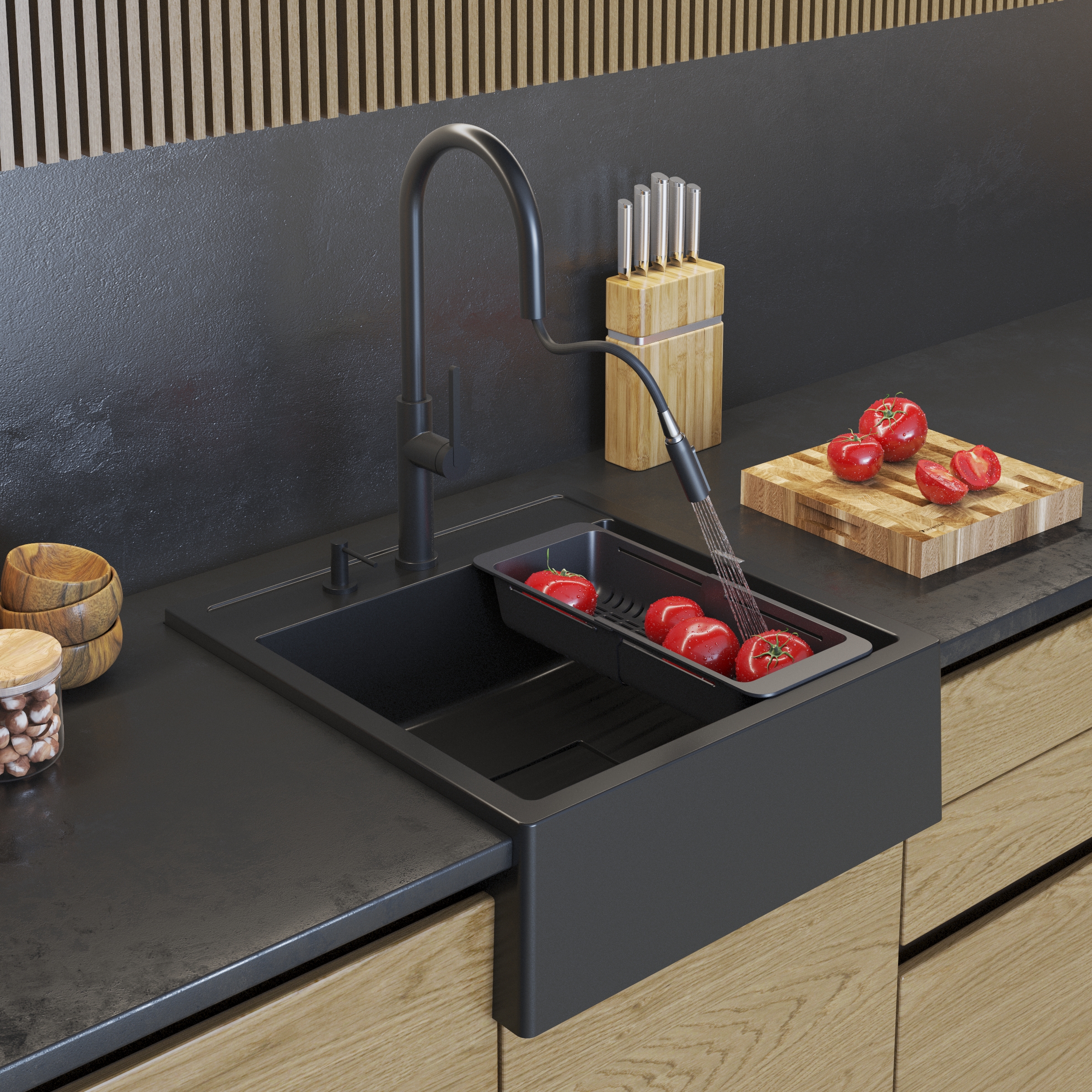 Model rotund realizat din material plastic durabil care se integrează perfect în suprafața chiuvetei și completează aspectul vizual al spațiului din bucătărie.