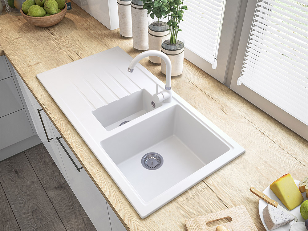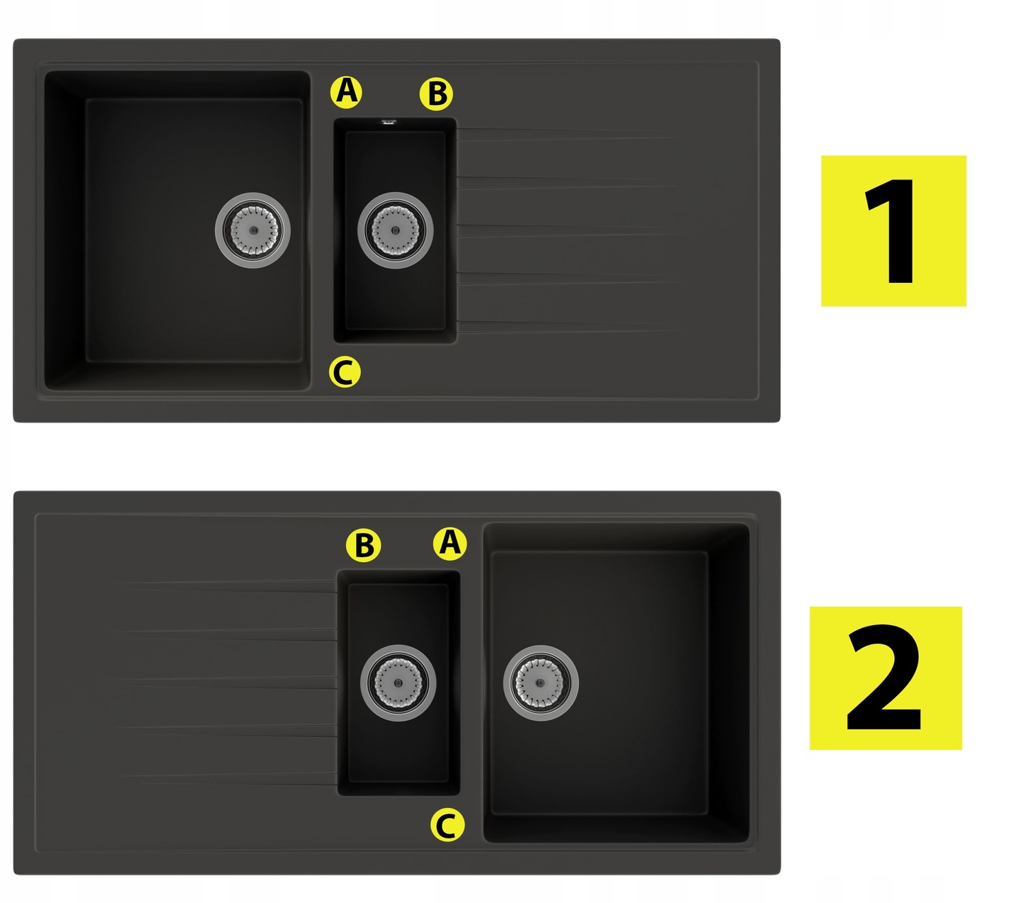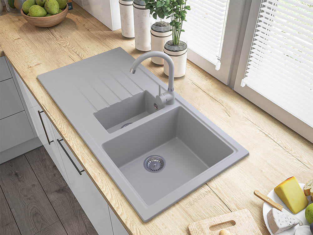 Design inteligent care permite utilizarea maximă a funcționalităților chiuvetei și asigură o exploatare deosebit de practică. Cuva confortabilă demonstrează durabilitate ridicată împotriva pericolelor zilnice, cum ar fi zgârieturi, decolorări sau șocuri termice (temperaturi ridicate și scăzute ale apei). Gama variată de culori permite o combinație perfectă a texturii și culorii chiuvetei cu blatul bucătăriei, dar și cu restul echipamentelor. Modelul permite personalizarea individuală a găurilor pentru chiuvetă – de la robinete, dozator de lichide sau buton pentru sifon automat.