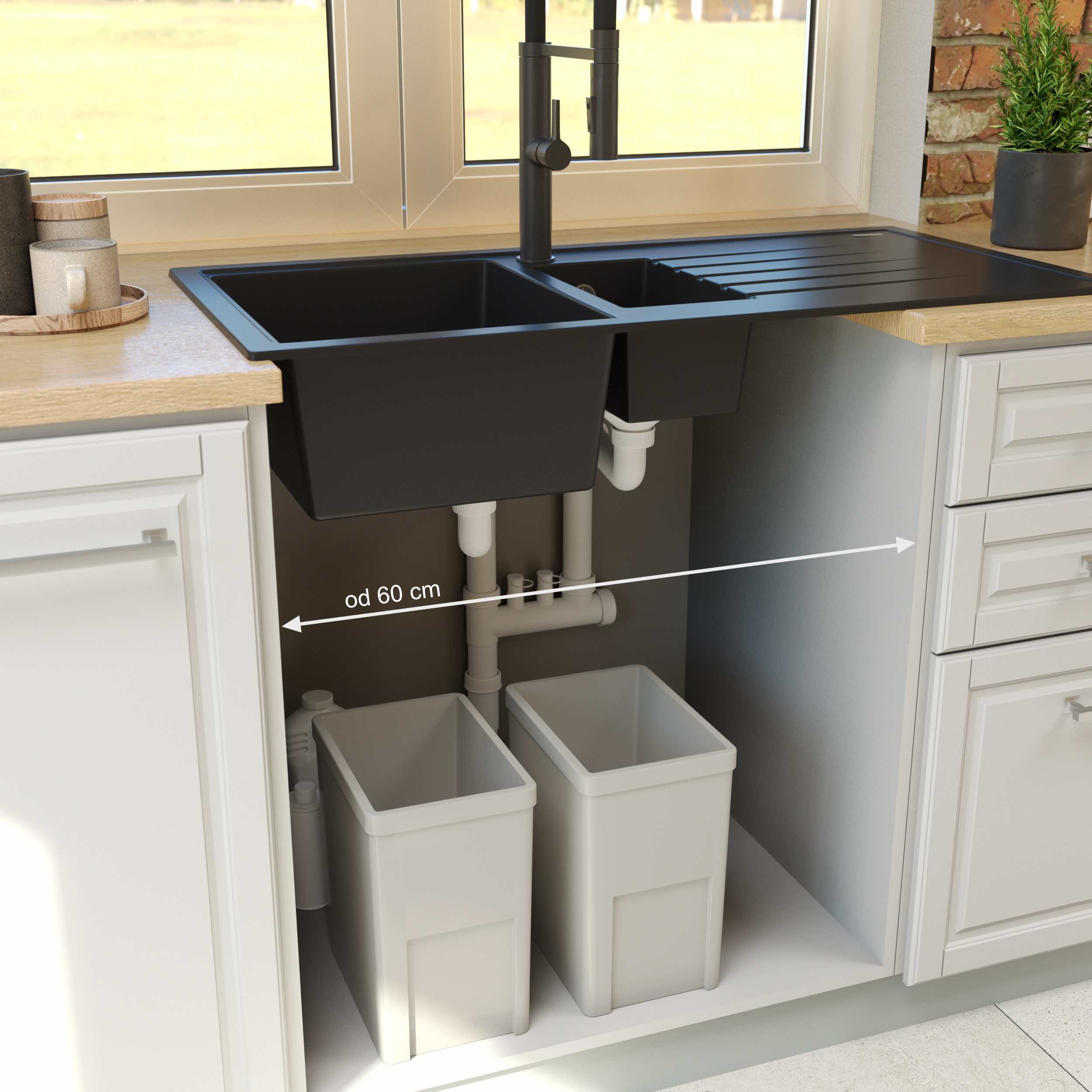 Precizia în timpul procesului de fabricație permite o potrivire perfectă a chiuvetei pentru dulapuri de la 60 cm. Structura sifonului contribuie la maximizarea spațiului disponibil sub blat, oferind astfel loc suplimentar pentru recipiente de reciclare sau alte accesorii de bucătărie. Sifonul include un sistem anti-revers și posibilitatea de conectare la mașina de spălat sau mașina de spălat vase. Pentru a simplifica instalarea, chiuveta vine cu un ghid detaliat de montaj.