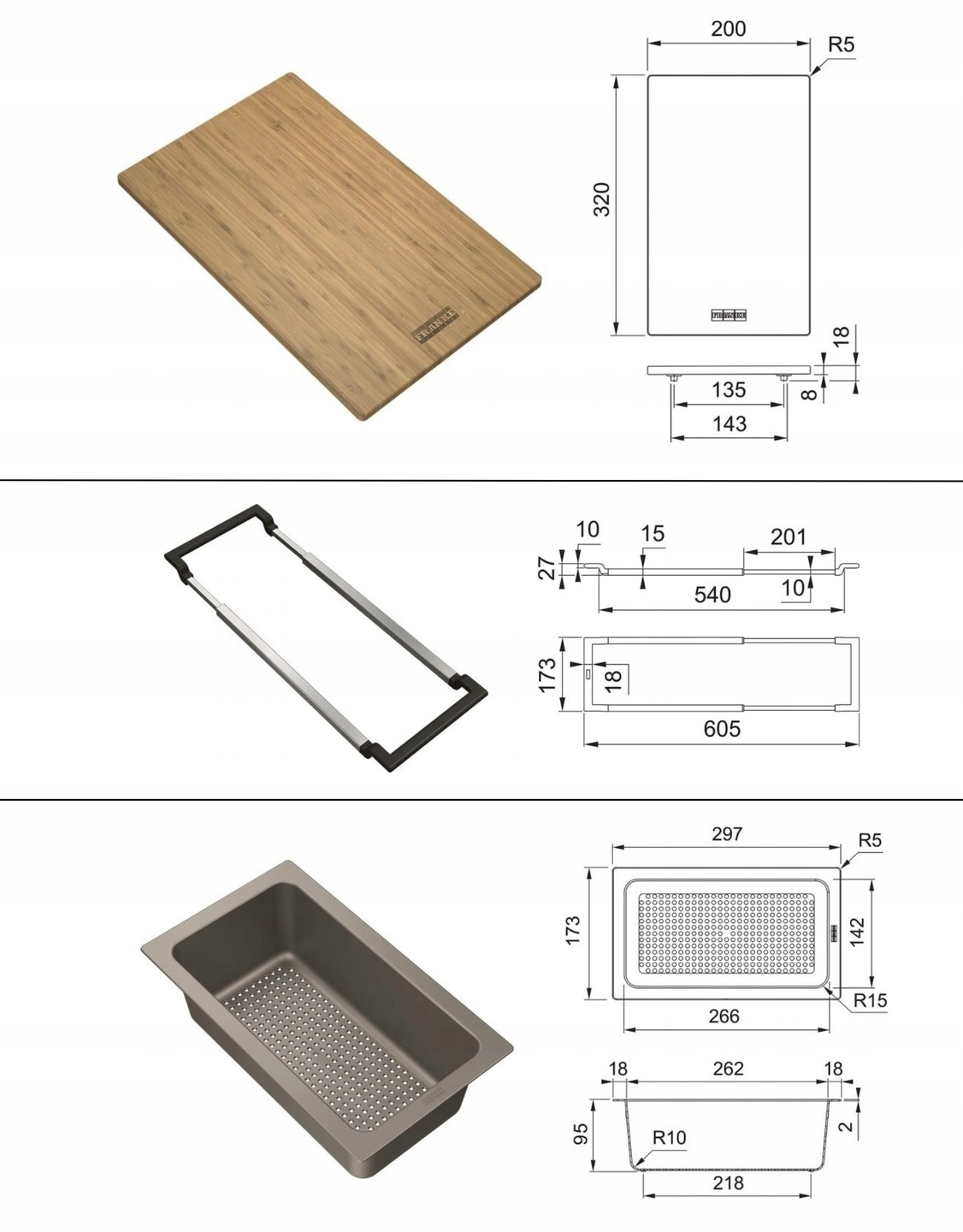 Setul conține: șină telescopică, tocător din bambus, grătar pentru scurgere