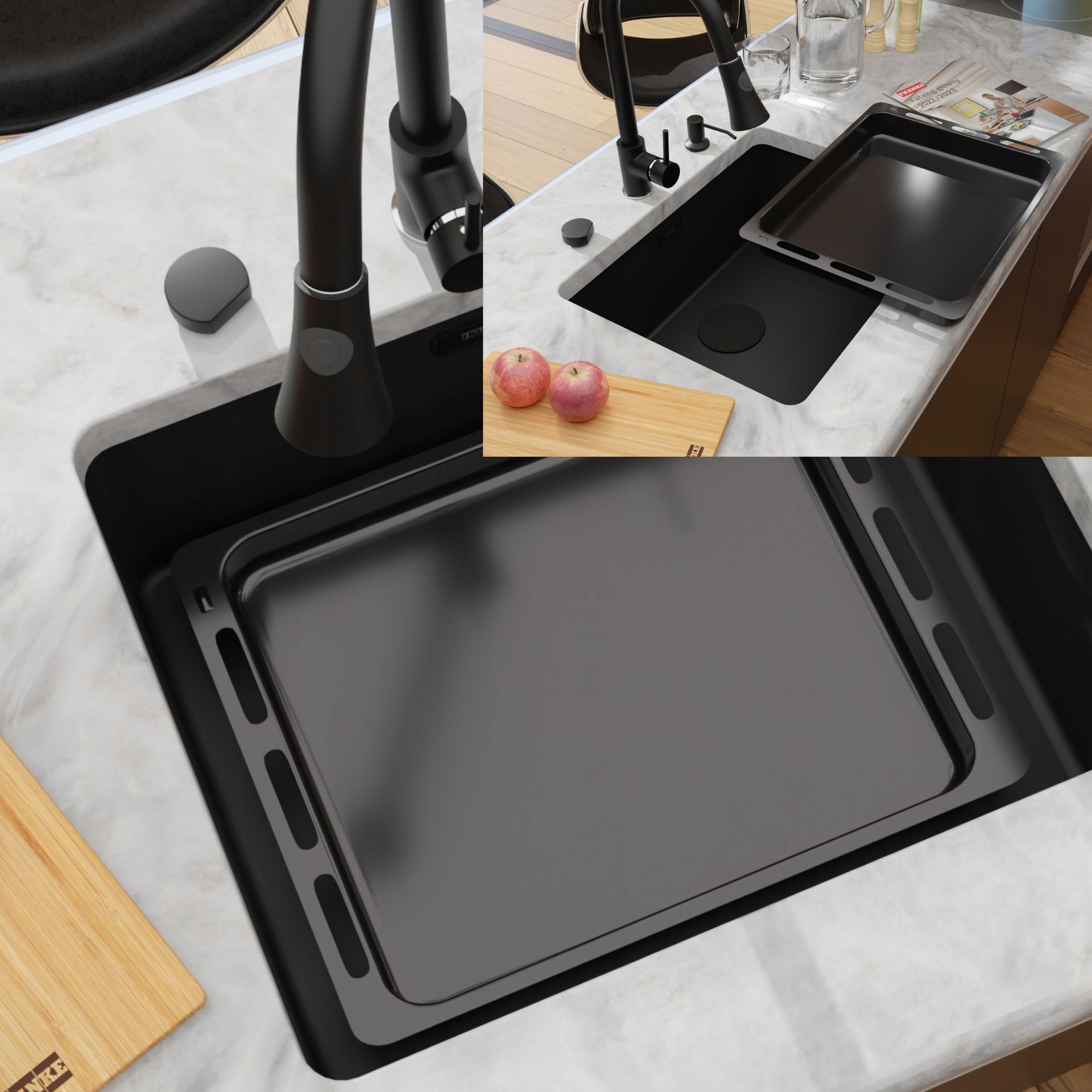 Setul conține: șină telescopică, tocător din bambus, grătar pentru scurgere