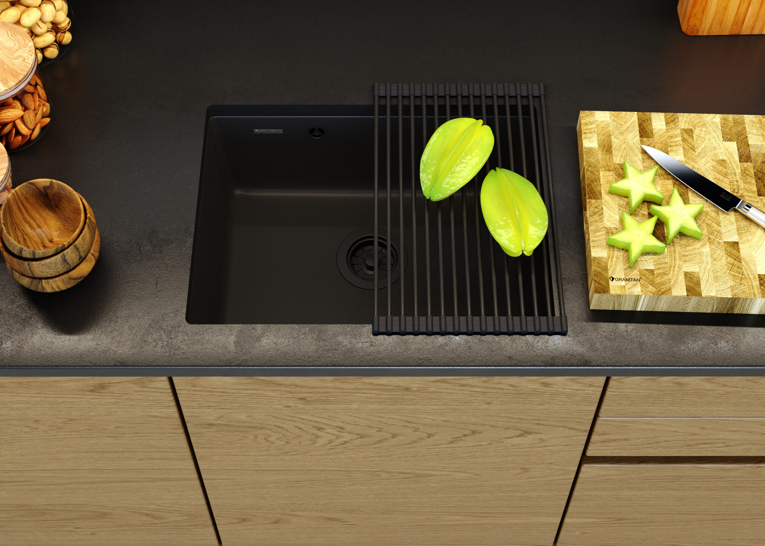 Chiuvetă granit neagră sub blat + sifon + scurgător 60