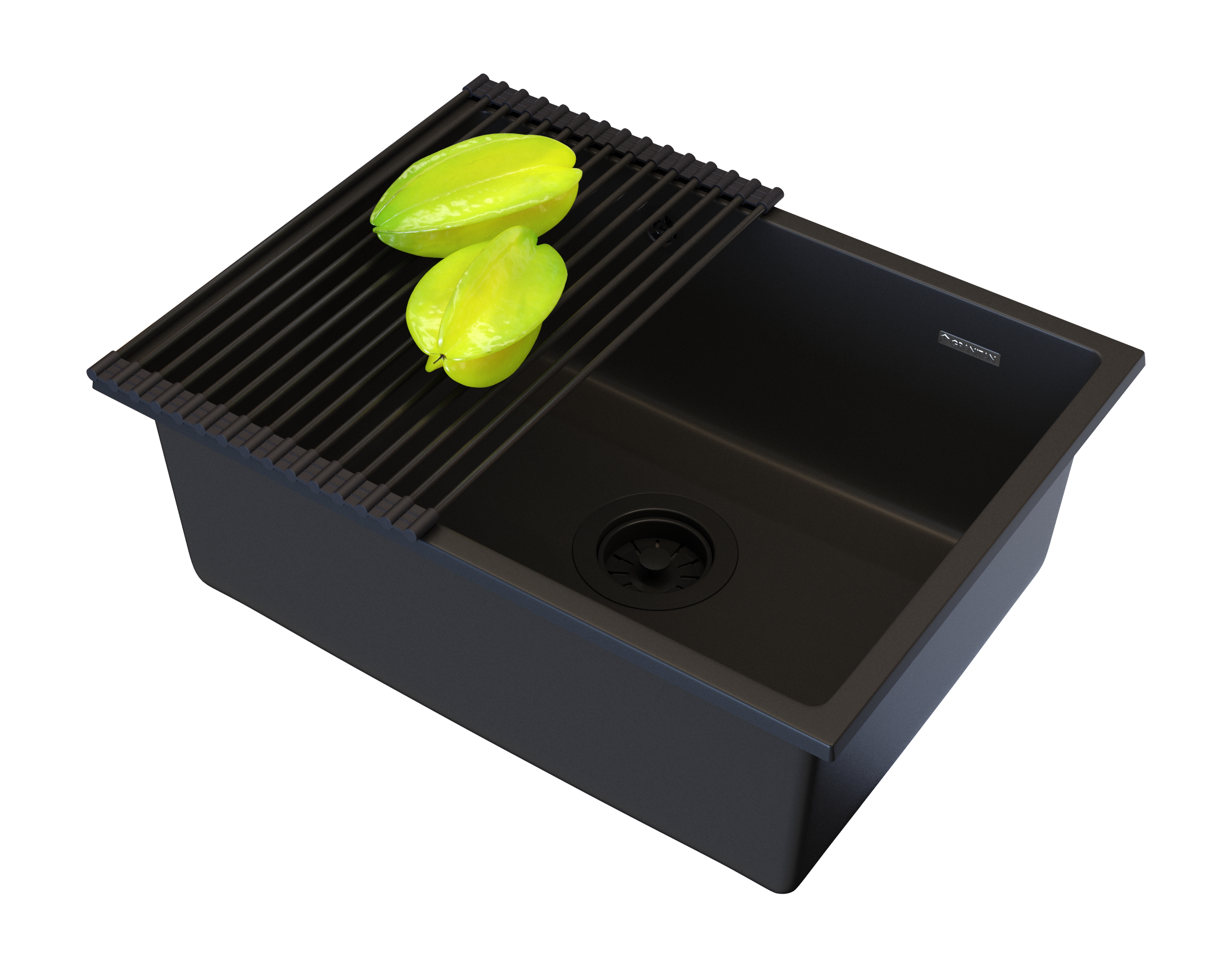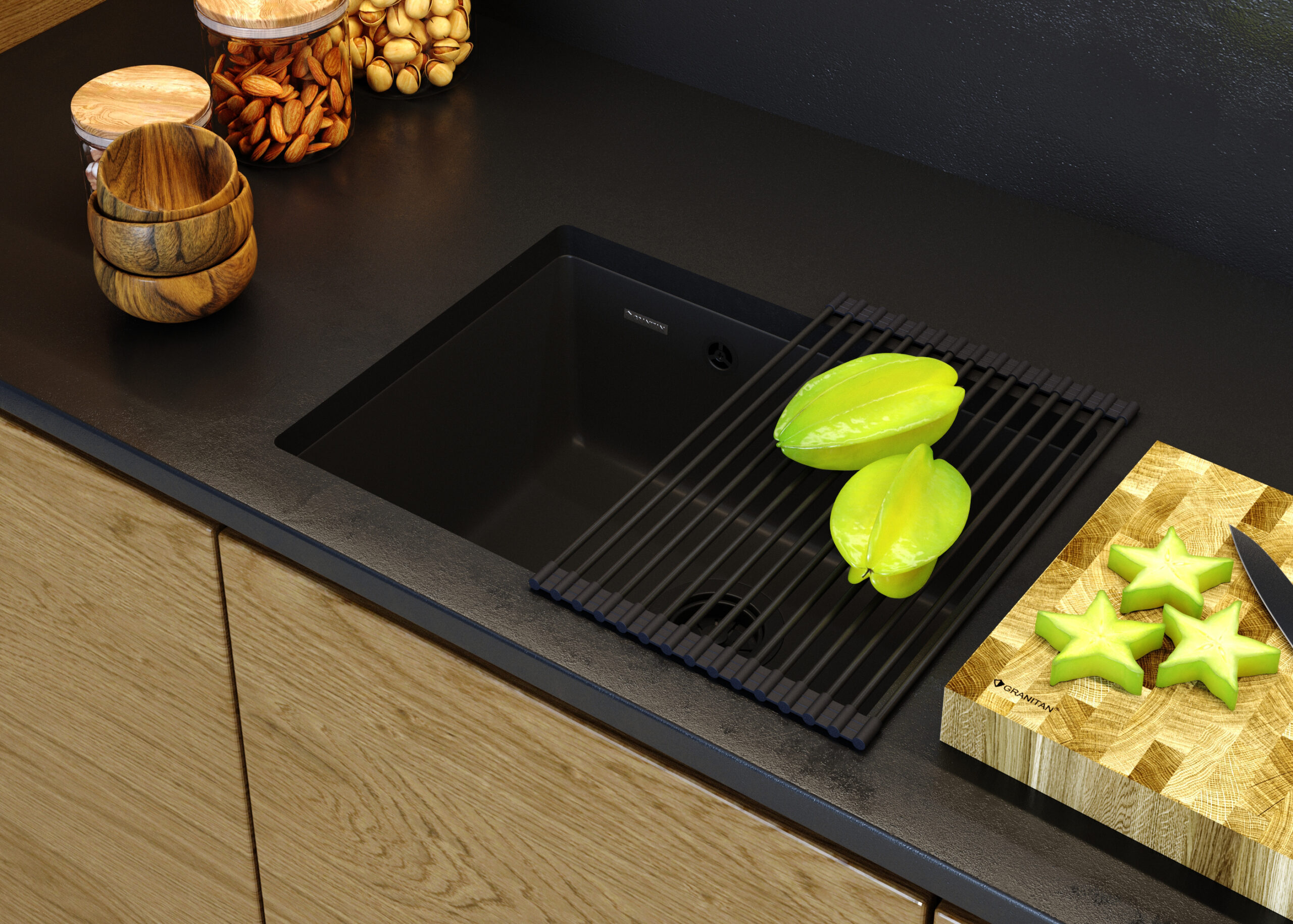 Chiuvetă granit neagră sub blat + sifon + scurgător 60