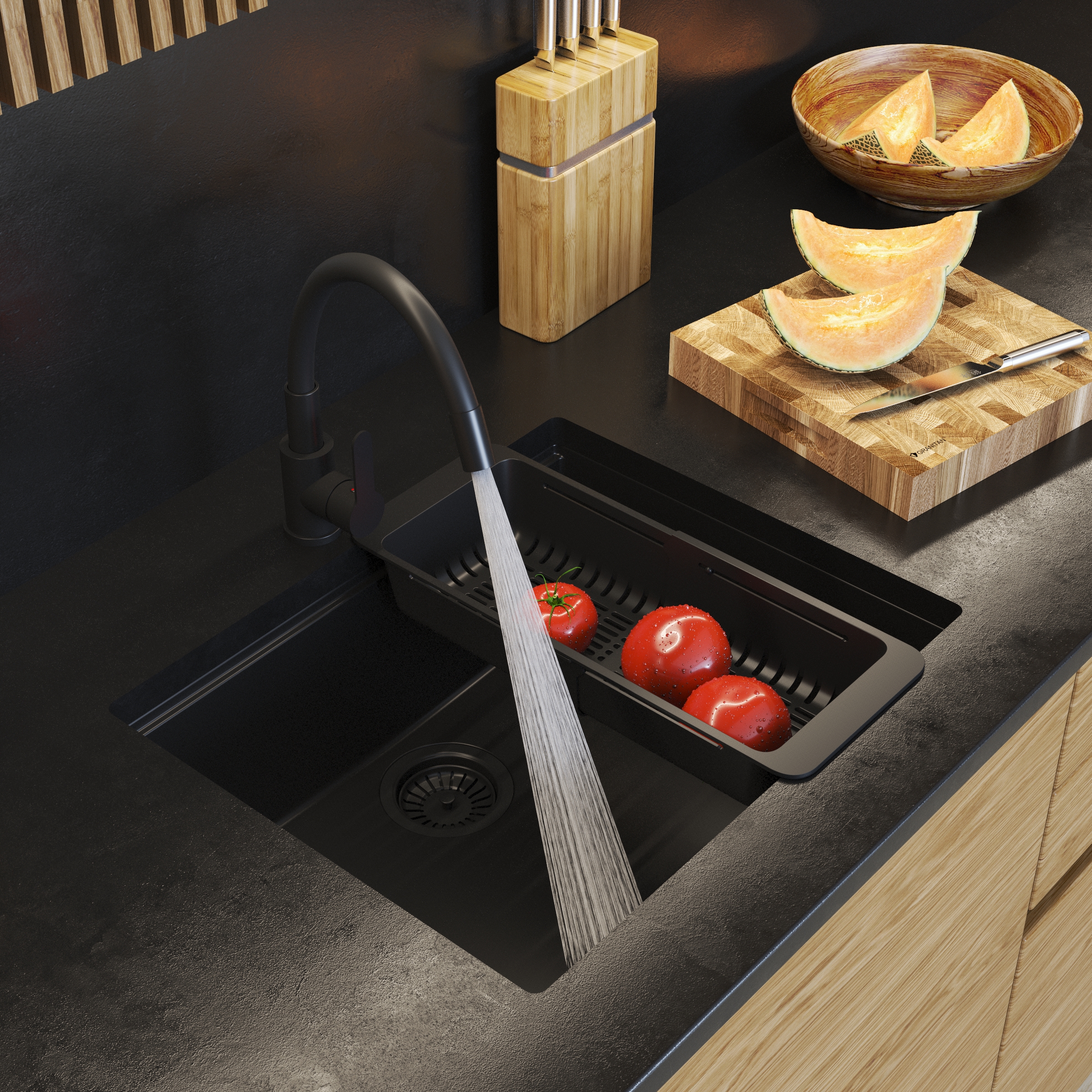 Chiuvetă elegantă din granit de înaltă calitate, ideală pentru bucătăriile moderne. Forma geometrică și montajul sub blat creează o suprafață uniformă cu blatul. Designul universal și paleta clasică de culori se potrivesc perfect cu blaturi din piatră naturală, conglomerate și materiale compozite.