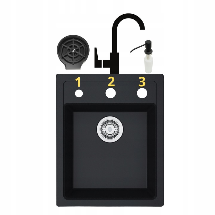 Conținutul setului: chiuvetă, baterie, sifon, țevi, cleme de fixare, dozator, spălător pentru pahare, suport telescopic