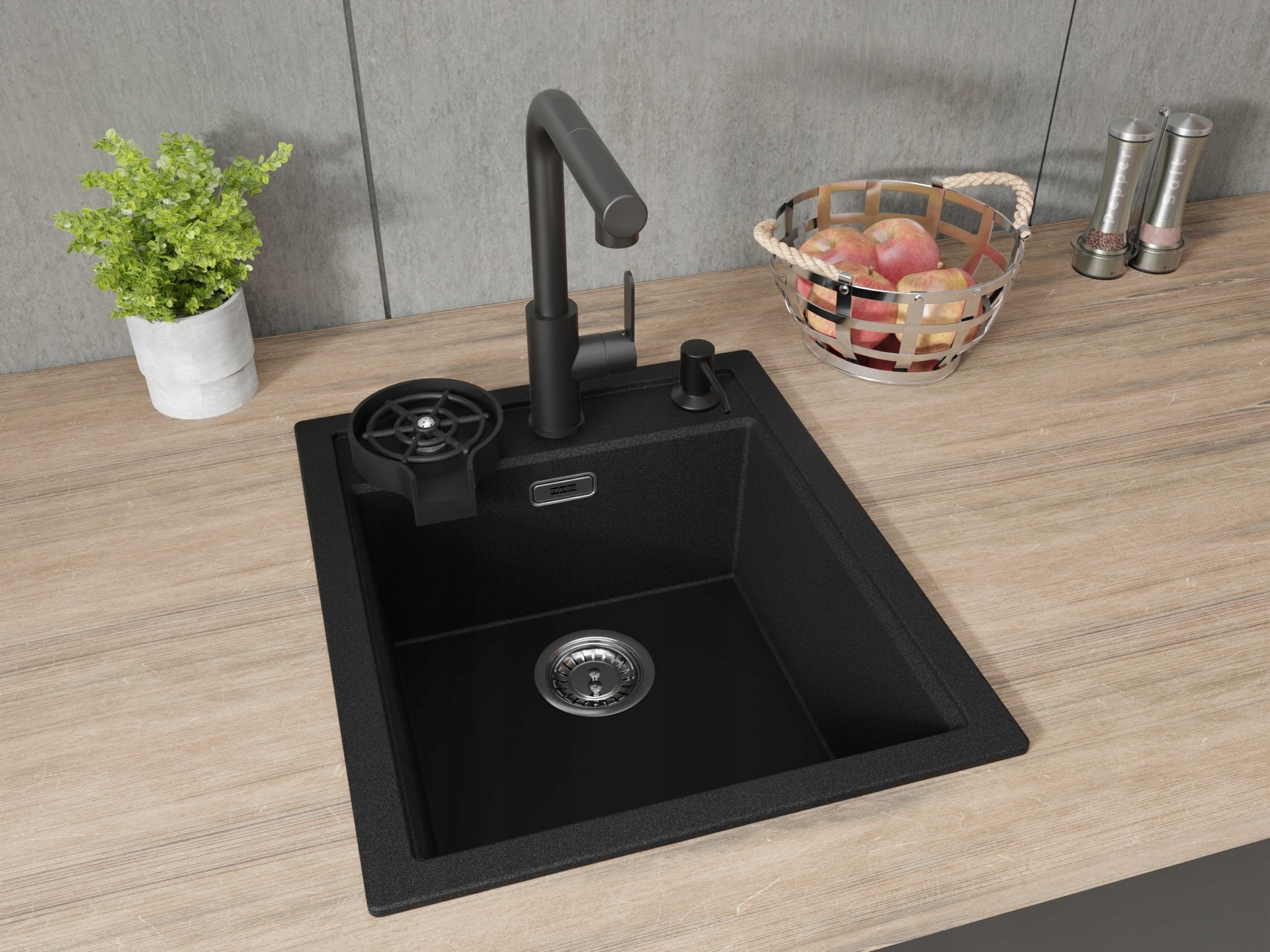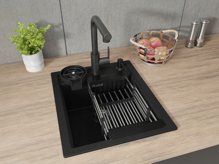 Conținutul setului: chiuvetă, baterie, sifon, țevi, cleme de fixare, dozator, spălător pentru pahare, suport telescopic