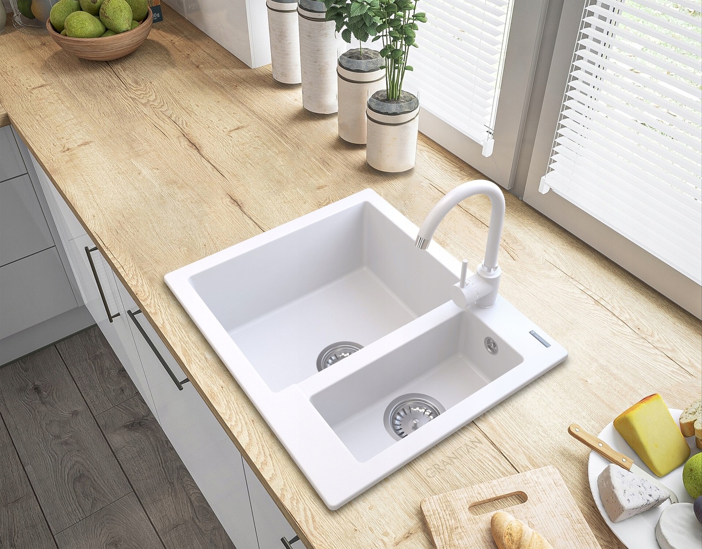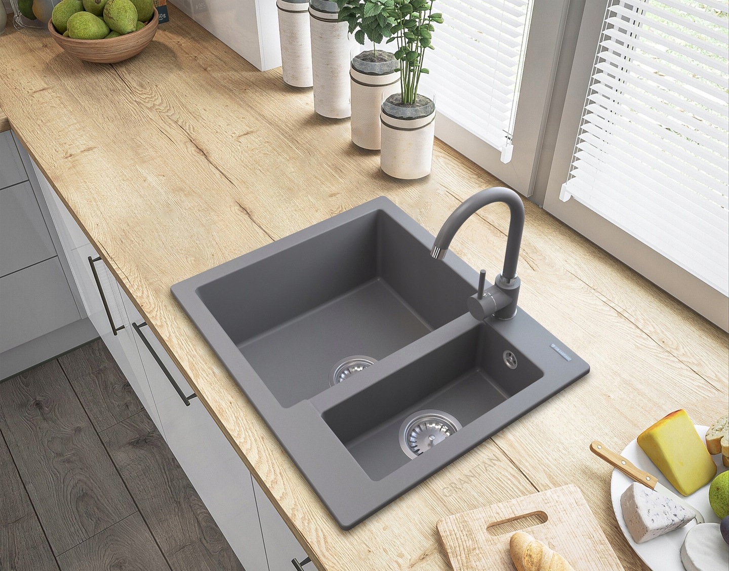 Chiuveta KOS este o chiuvetă de granit cu o cuvă și jumătate, destinată pentru montaj pe blat. Design-ul său bine gândit permite utilizarea maximă a posibilităților chiuvetei și asigură că folosirea zilnică va fi extrem de funcțională. Cuva confortabilă oferă rezistență ridicată la problemele zilnice, cum ar fi zgârieturi, decolorări sau șoc termic (temperaturi ridicate și scăzute ale apei). Gama variată de culori permite combinarea perfectă a texturii și culorii chiuvetei cu blatul de bucătărie, precum și cu restul echipamentului. Modelul permite personalizarea individuală a găurilor în chiuvetă, de la robinetul de bucătărie până la dozatorul de lichid sau maneta sifonului automat.