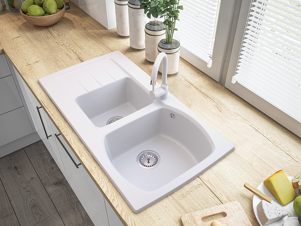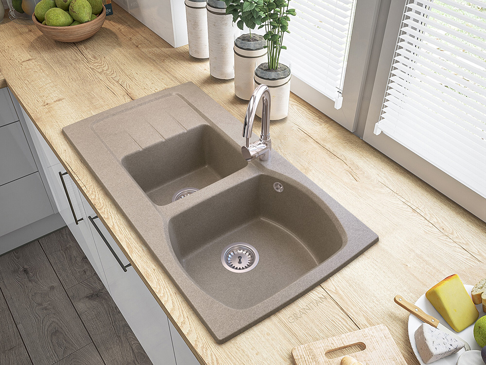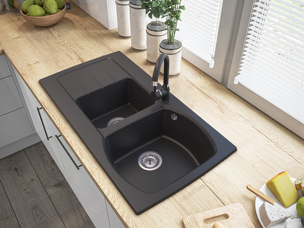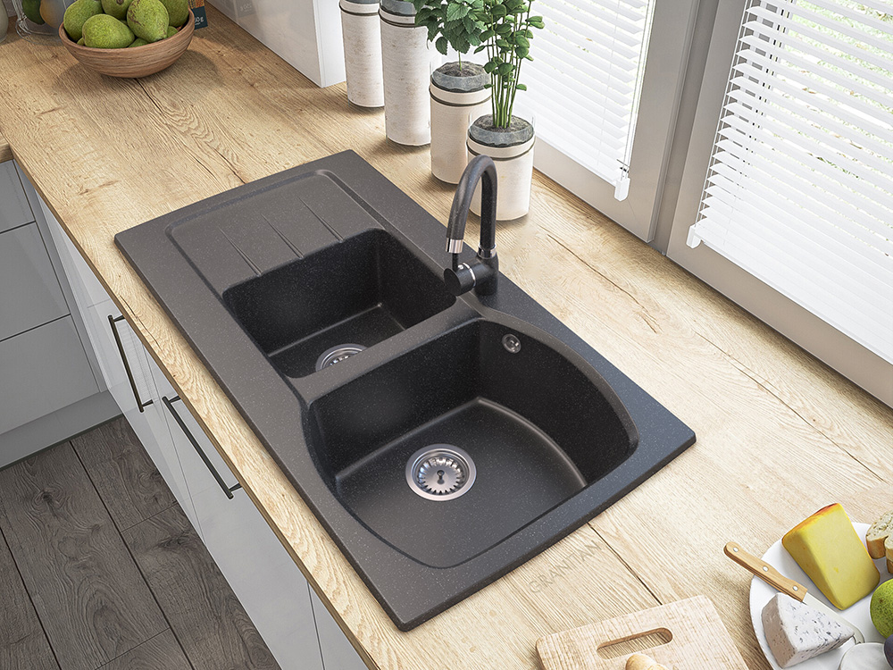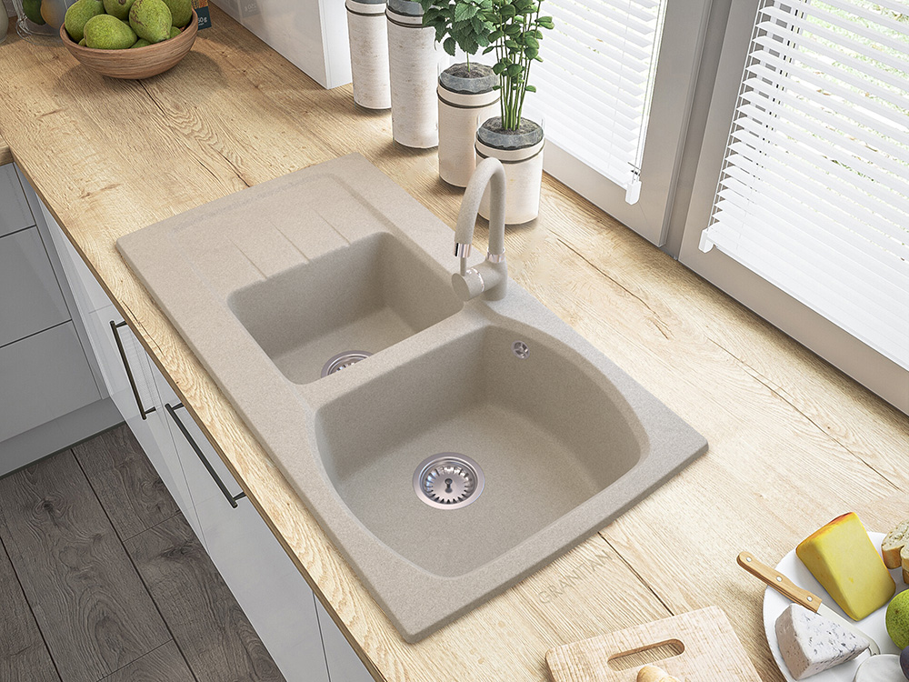 Przemyślany projekt pozwala wykorzystać do maksimum możliwości zlewu i sprawić, że jego eksploatacja będzie niezwykle funkcjonalna. Wygodna komora wykazuje wysoką wytrzymałość na codzienne zagrożenia takie jak: zarysowania, przebarwienia czy szok termiczny (wysokie i niskie temperatury wody). Bogata gama kolorystyczna umożliwia idealne połączenie faktury i barwy zlewu z blatem kuchennym, a także pozostałym wyposażeniem. Model pozwala na indywidualną personalizację otworów w zlewie – począwszy od baterii kuchennej, poprzez dozownik do płynu czy pokrętło syfonu automatycznego.