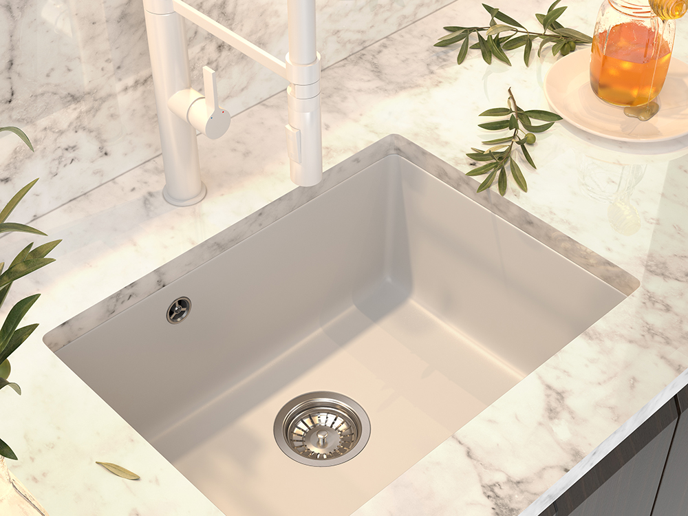 Forma clasică și geometrică, combinată cu sistemul de montaj sub blat, face ca chiuveta să creeze o suprafață impecabilă, integrată cu blatul bucătăriei.