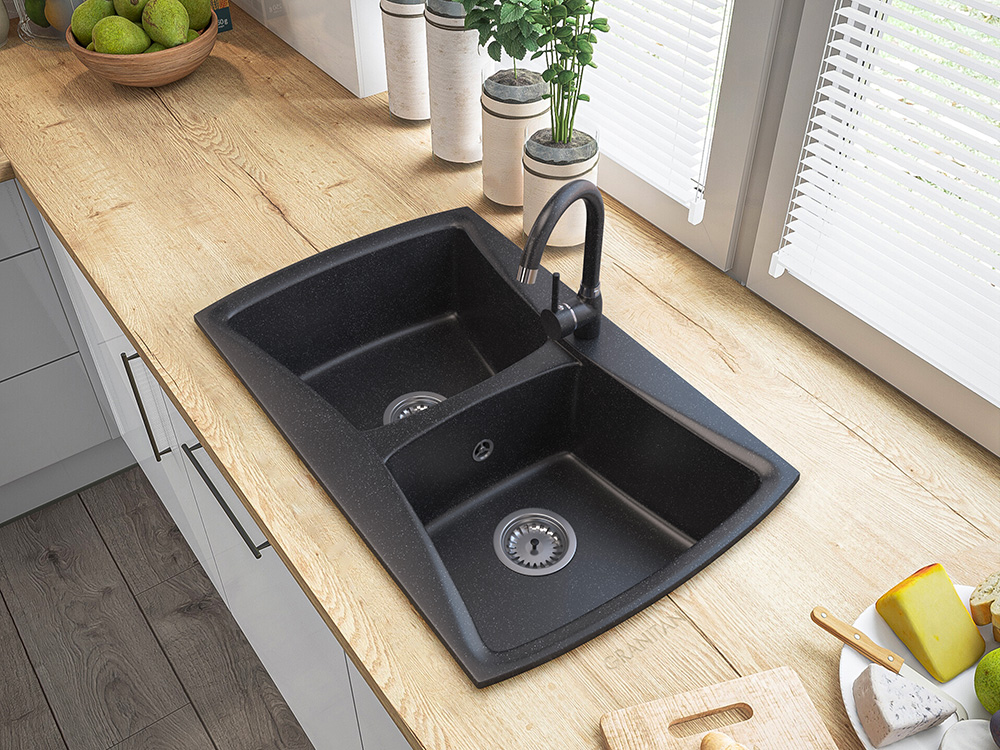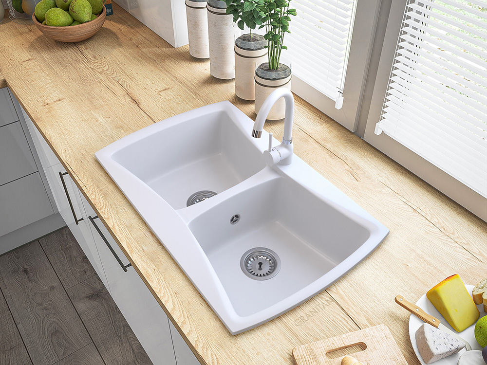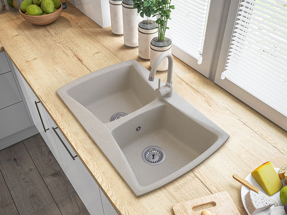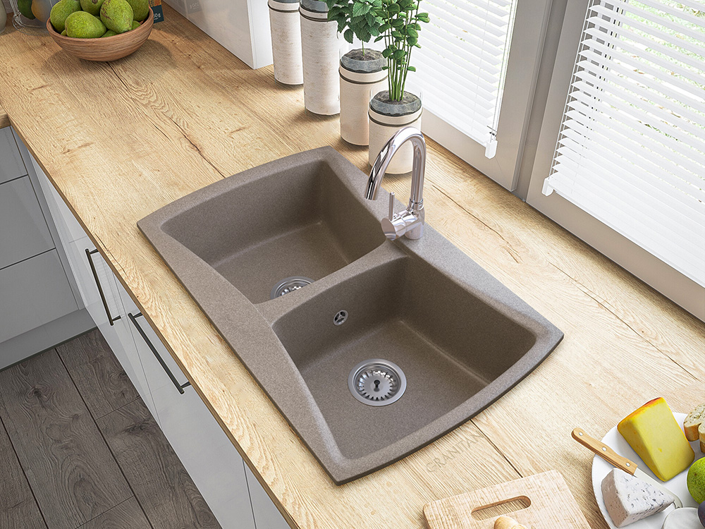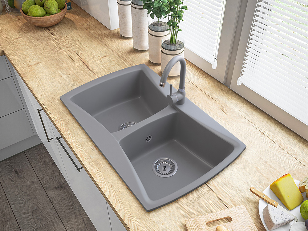 Chiuveta DOUBLE este o chiuvetă clasică cu două compartimente mari, destinată montajului pe blatul de lucru. Un design gândit maximizează posibilitățile chiuvetei, făcând utilizarea ei extrem de practică. Spatiul generos al compartimentelor oferă o rezistență excepțională la pericolele zilnice cum ar fi: zgârieturi, decolorări sau șocuri termice (temperaturi mari și joase ale apei). Gama diversă de culori permite o integrare perfectă a texturii și culorii chiuvetei cu blatul de bucătărie și cu restul echipamentelor. Modelul permite personalizarea individuală a găurilor în chiuvetă – de la robinetul de bucătărie, la sistemul de dozare a soluției de curățare sau mânerul sifonului automat.