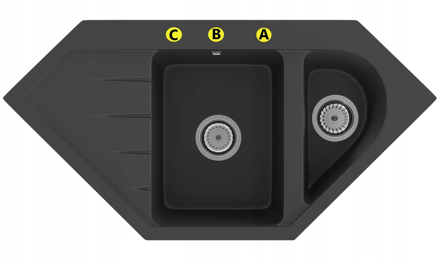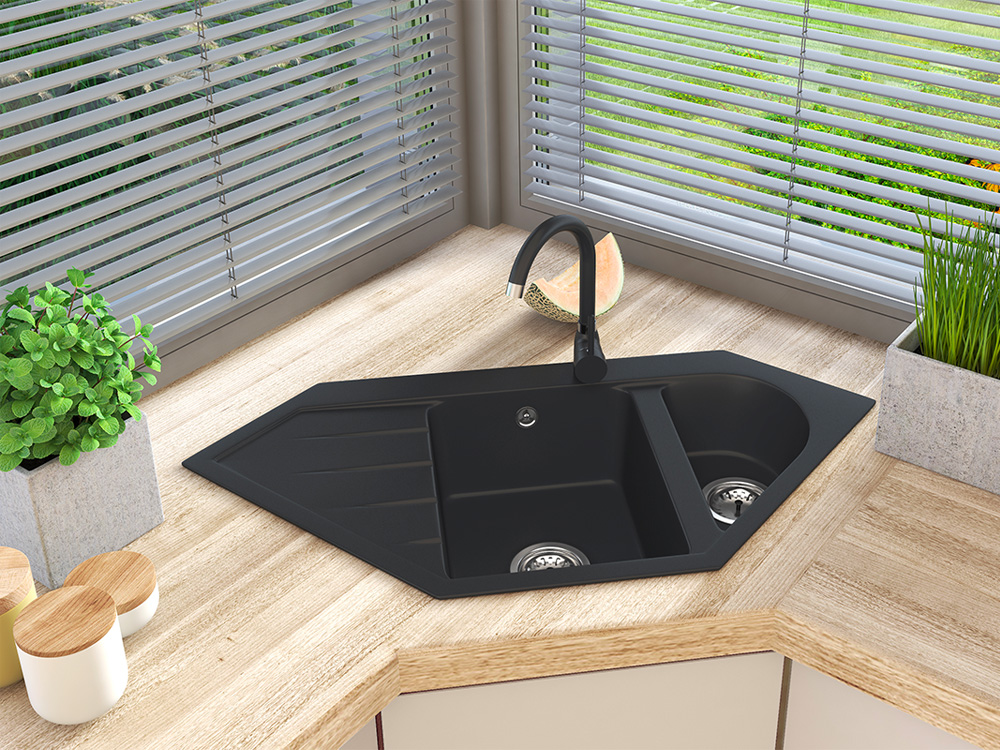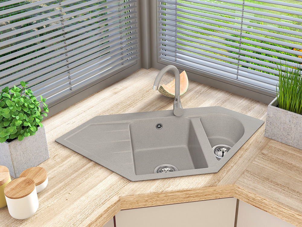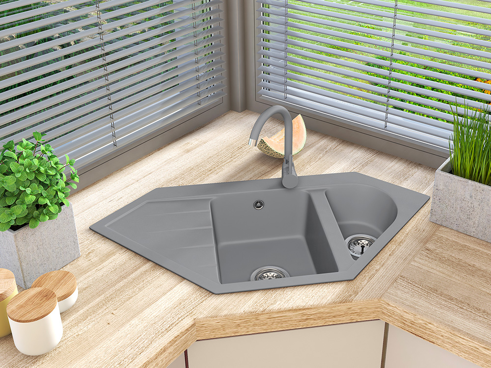 Un design gândit atent permite valorificarea la maxim a funcționalităților chiuvetei și asigură utilizare funcțională. Cuva confortabilă are rezistență ridicată la riscuri cotidiene precum zgârieturi, decolorări sau șocuri termice (temperaturi ridicate și scăzute ale apei). Gama variată de culori permite o îmbinare perfectă a texturii și culorii chiuvetei cu blatul de bucătărie, dar și cu restul dotărilor. Modelul permite personalizarea individuală a găurilor pentru chiuvetă – de la baterie, la dozatorul de lichid sau volanta sifonului automat. Chiuveta este destinată montării în dulap colțar de minim 75 cm.