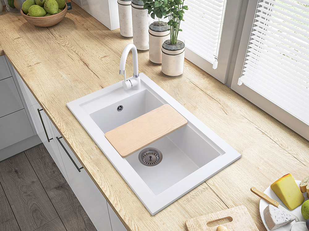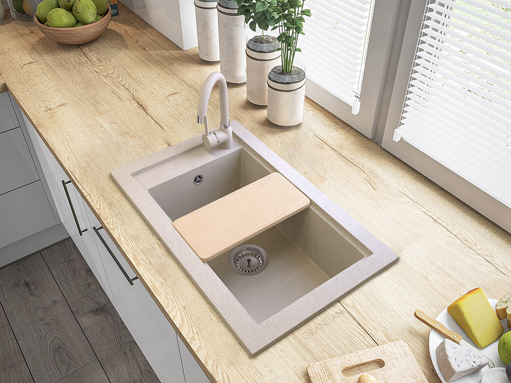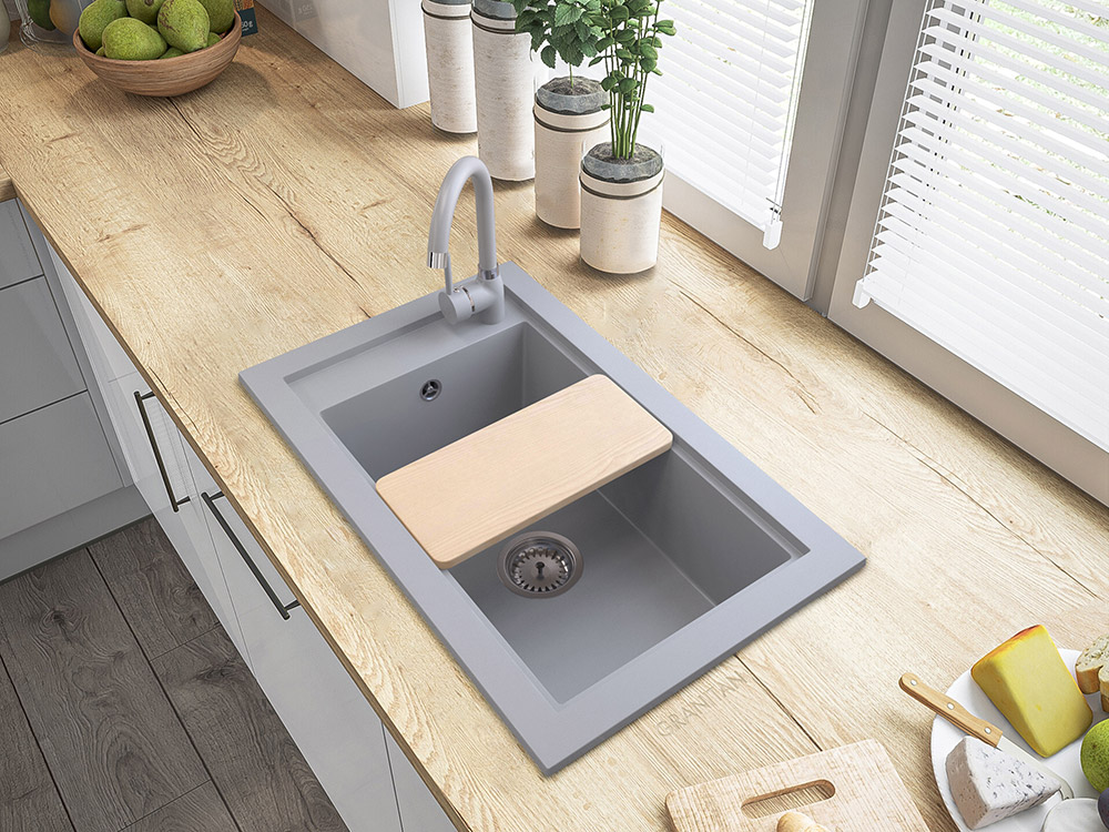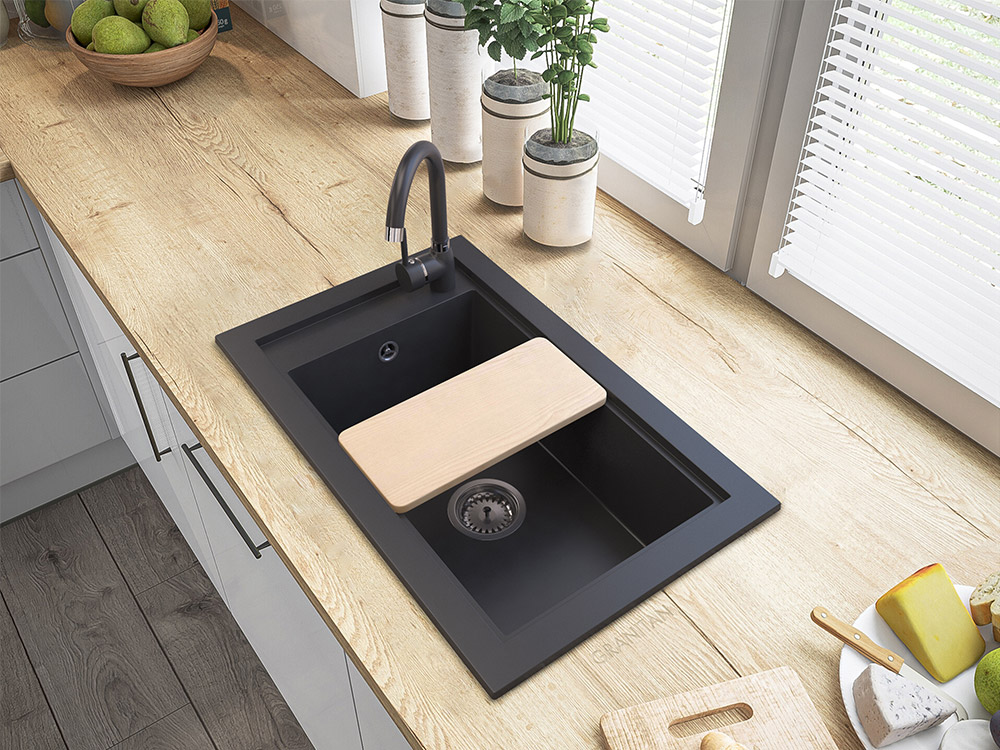 Chiuveta din granit este un produs care prin aspectul său atemporal și în special aspectul universal oferă multe posibilități de decorare. Forma și dimensiunea sa pot fi potrivite cu ușurință în interiorul bucătăriei, astfel încât să vă puteți bucura din plin de toate funcționalitățile sale. Proporțiile păstrate nu domină spațiul, iar forma minimalistă introduce o armonie elegantă în spațiul bucătăriei. Modelul proiectat oferă o cuvă generoasă, care asigură confort în timpul spălării zilnice, făcând-o o experiență plăcută. Personalizarea individuală permite realizarea unor găuri suplimentare în suprafața chiuvetei, destinate dozatorului de lichide sau butonului pentru sifonul automat. Astfel, puteți crea un set care să răspundă nevoilor chiar și celui mai exigent client.