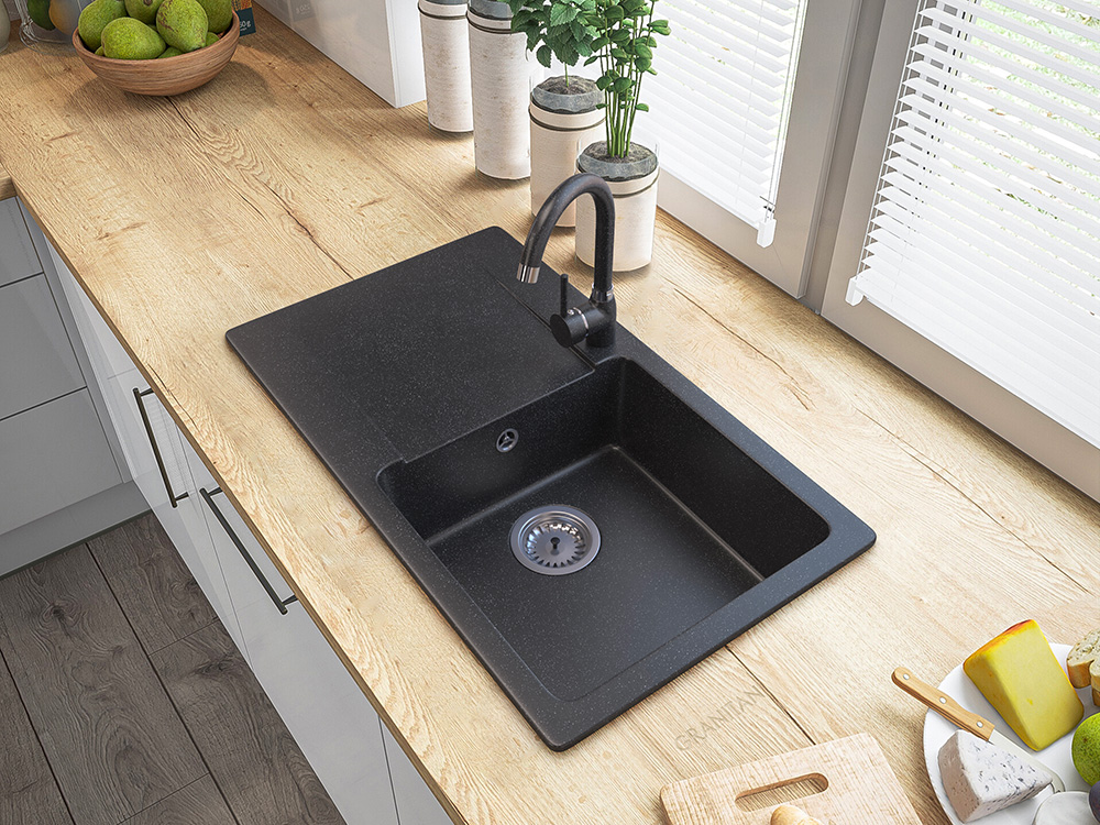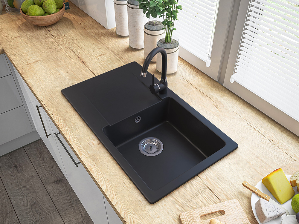 Zlew w kolorze czarnym, bardzo ładny, solidnie wykonany. Prezentuje się lepiej niż się spodziewałem. Czerń bez żadnych skaz całość bardzo gładka więc nie ma problemu z utrzymaniem czystości. Duża komora o doskonałych wymiarach więc nic nie leży skosem przed myciem. Wielkość ociekarki idealna.