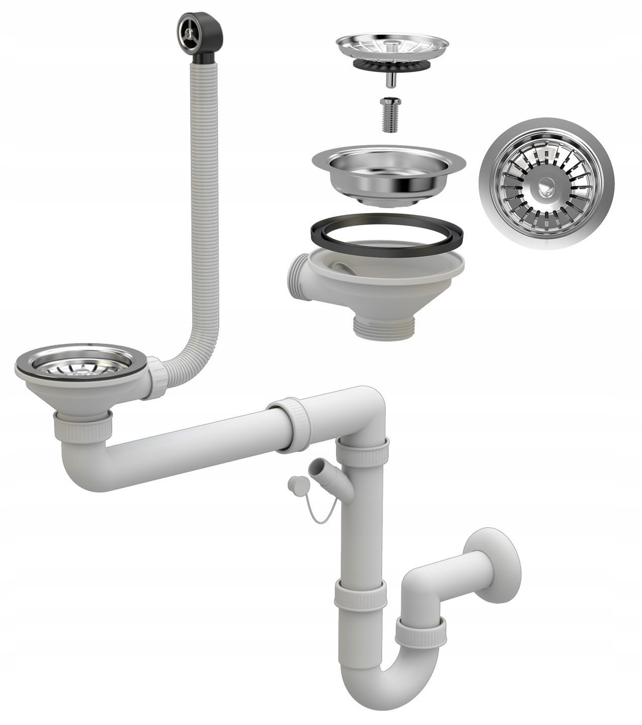 Model de sifon manual de un singur compartiment pentru chiuvetă, cu posibilitatea conectării mașinii de spălat vase sau a mașinii de spălat rufe (economisire de spațiu).