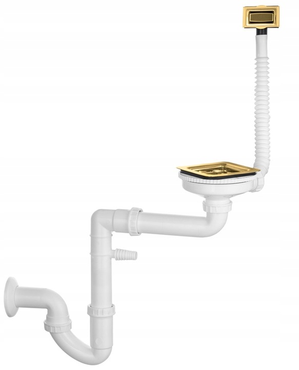 • Sifon manual pătrat montat pe perete auriu cu posibilitatea conectării unei mașini de spălat vase sau a unei mașini de spălat rufe (economisire de spațiu)